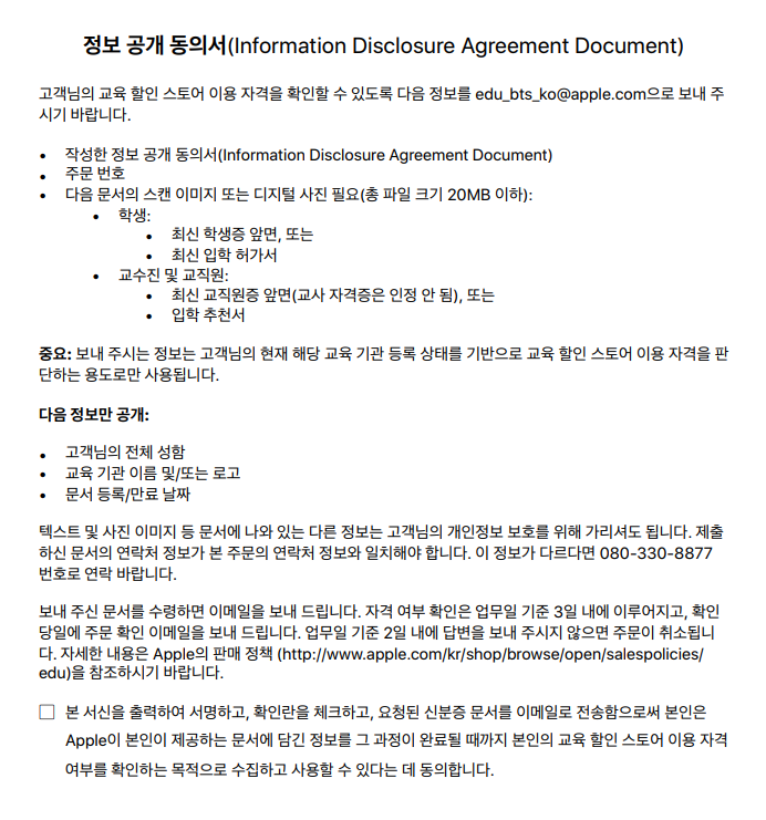 교육할인을 받기 위한 증명서류 입니다. 주소는 edu_bts_ko@apple.com 으로 전달하면 되며, 필요한 서류는 다음과 같습니다.