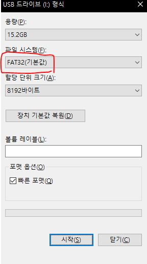 파일 시스템을 FAT32로 설정한 후 시작, 포멧합니다.