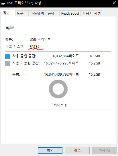 이런식으로 파일 시스템이 FAT32인지 확인해주세요.