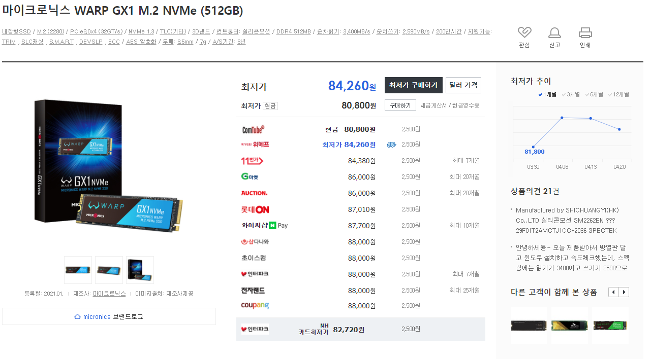 가격 역시 8.4만원정도로 형성되어있고, 높은 속도와 SLC 캐쉬를 지녔기 때문에 상당히 가성비가 좋다고 볼 수 있습니다. 비교군이였던 삼성 SSD는 10만원 가량 합니다.
