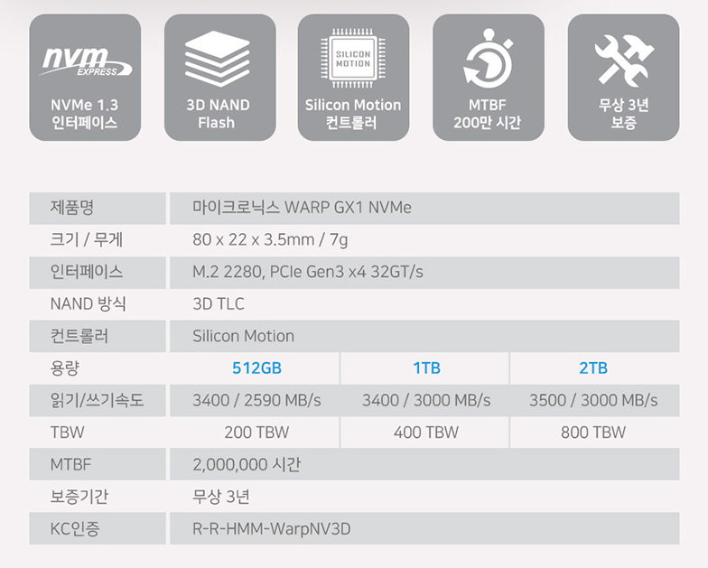 스펙은 다음과 같고, 보증기간은 무상 3년, TBW(TeraByte Written)은 200(즉 총 200TB “쓰기” 가능), MTBF(Mean Time Between Failure, 평균 무고장 시간)은 2백만시간을 보장합니다.