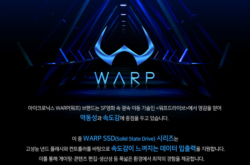 네이밍에 붙은 WARP는 역동성과 속도감의 의미를 가진 단어로써, 그만큼 빠른 속도를 가진 SSD 제품군임을 나타냅니다.