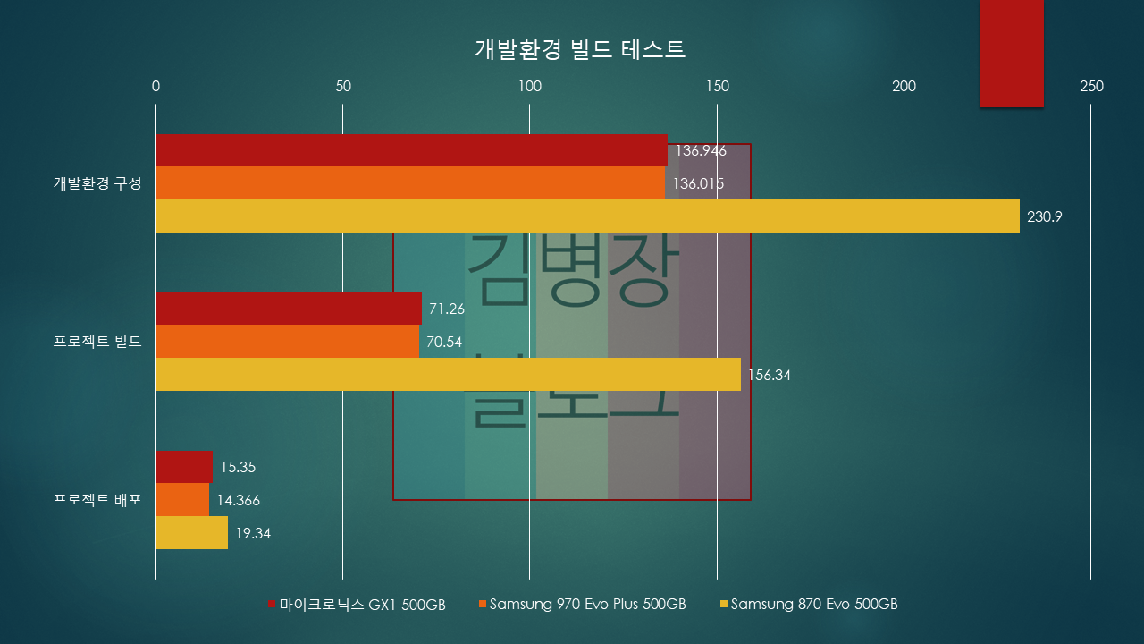 개발환경 구성, 빌드, 배포까지 삼성과 마이크로닉스 SSD에서 큰 차이는 없었습니다. 실사용 스펙이 상당히 준수한 것으로 보입니다.