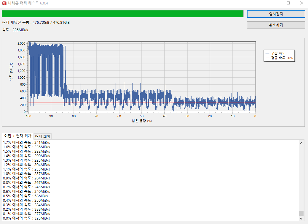 해당 320GB 구간의 경우, SSD의 컨트롤러 온도가 101도가량까지 올라가게 되어 속도가 낮아지는 구간입니다.