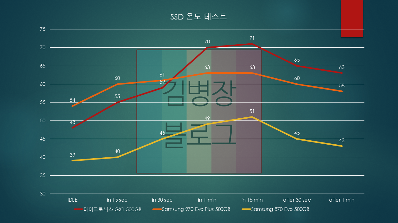 테스트 방법은, 나래온 더티테스트를 진행하는 동안 NAND의 온도를 측정하였으며, IDLE, 15초, 30초, 1분, 15분, 종료 후 30초, 1분 지점의 온도를 각각 테스트 했습니다.