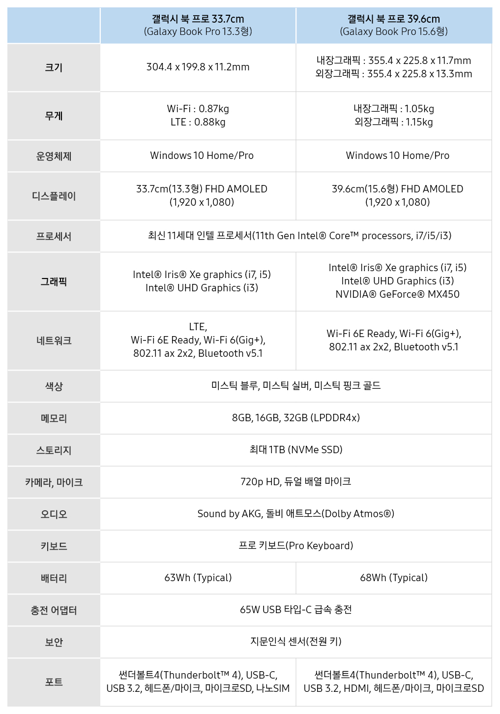 갤럭시 북 프로 13.3형 모델은 11.2mm 두께에 무게는 868g로 역대 삼성 ‘갤럭시 북’ 시리즈 중 가장 얇고 가볍게 설계되었습니다.