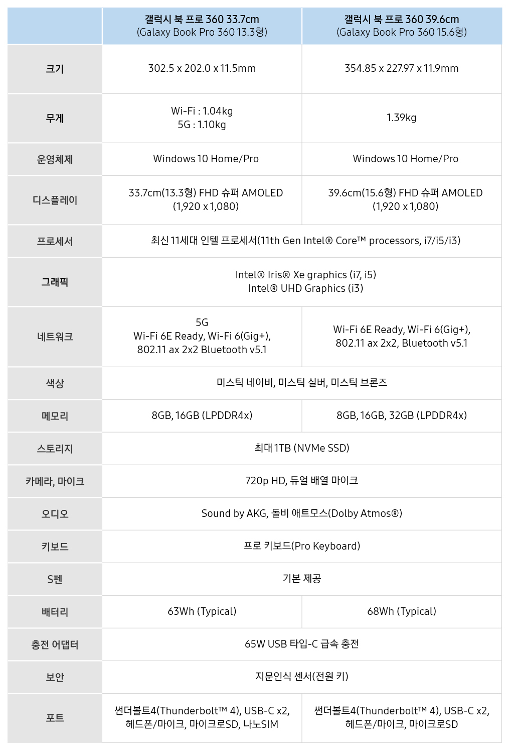 갤럭시 북 프로 360은 13.3형 모델과 15.6형 모델 각각 두가지가 있으며 13.3형 모델과 두께는 11.5mm 무게는 1.04Kg, 15.6형 모델은 두께가 11.9mm 무게는 1.39Kg 입니다.