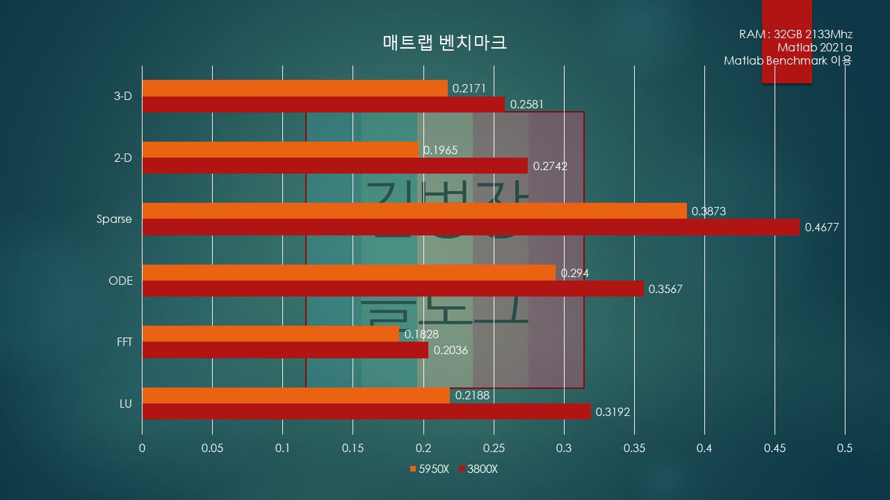 매트랩의 경우 역시 전체 코어를 사용하는게 아닌, 벤치마크중에는 매우 짧은 시간동안 단일코어 성능과 반응속도가 중요합니다. 그에 따라 5950X가 높은 성능을 보임을 알 수 있습니다.