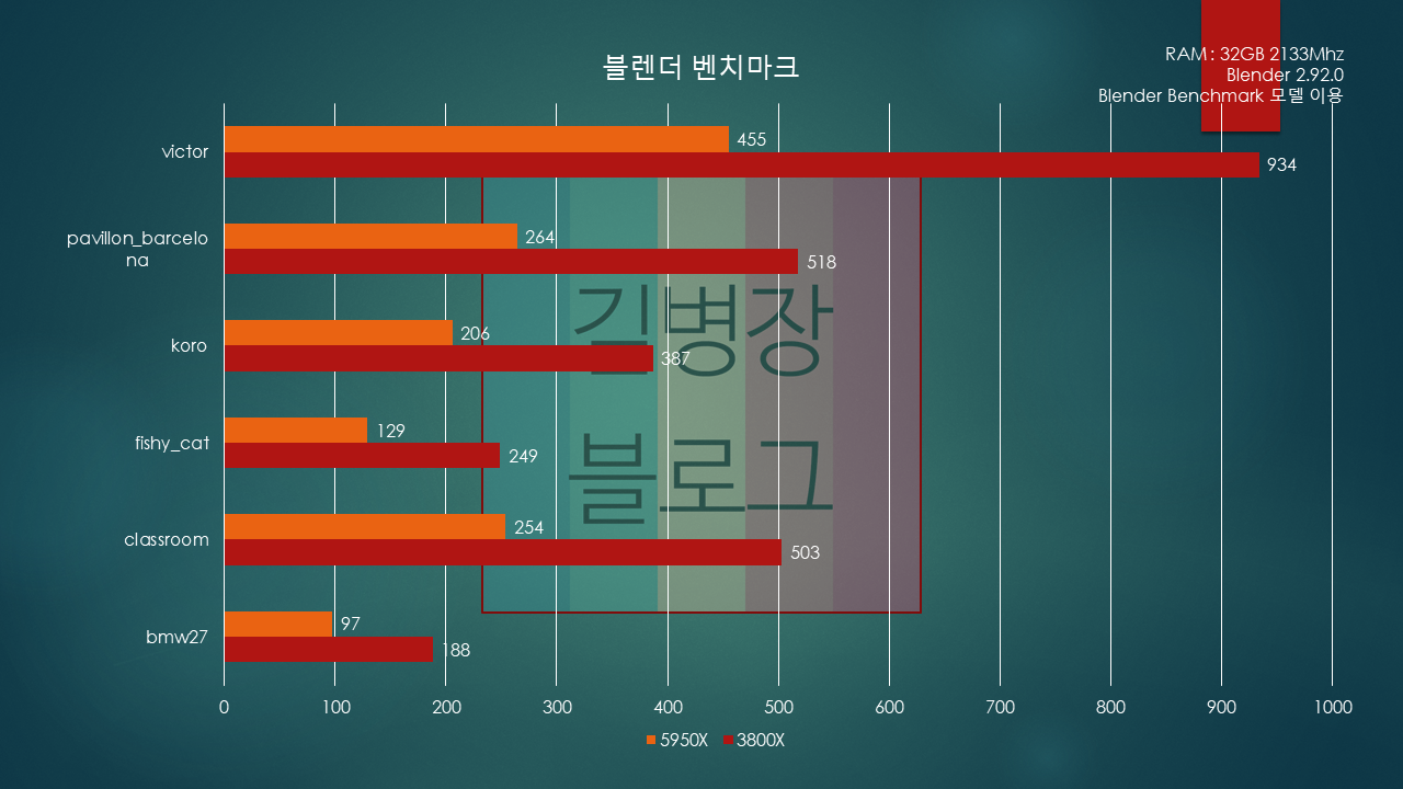 전체 코어를 활용하는 블렌더나 Sysbench벤치마크에서 역시, 코어의 차이와 성능의 차이를 크게 보여주었습니다.