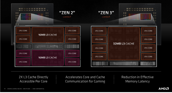 이 Cache가 Zen 2에서는 보시는것처럼 가운데 길에 가로막혔지만, Zen 3에서는 이를 하나로 합쳐 지연시간을 줄여주었습니다.