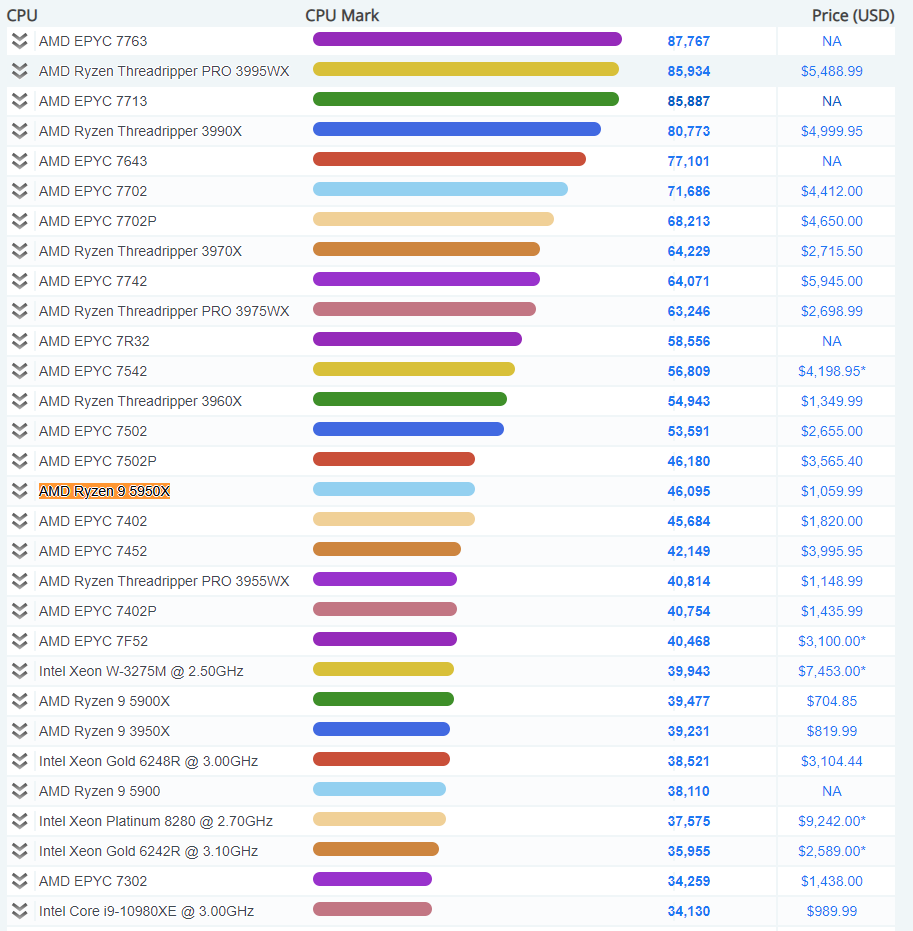 AMD Ryzen 9 5950X의 경우 msrp는 1059.99달러이지만, 위아래로 보시면 서버 CPU와 HEDP CPU로 가득한 가운데에 위치한걸 알 수 있습니다.