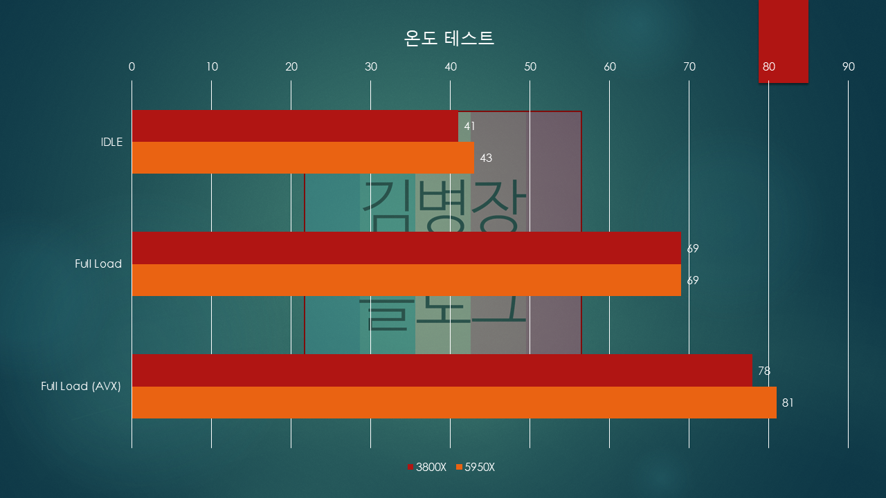 하지만 이러한 큰 성능차이에도 불구하고 온도는 비슷하고, 클럭차이는 코어 개수차이로 인해 성능이 더 뛰어나기 때문에, Zen 3 아키텍쳐를 사용한 5950X의 승리라고 볼 수 있습니다.