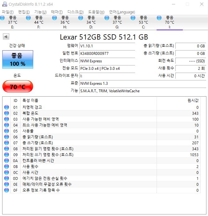 새로운 SSD라 읽기 / 쓰기량이 0으로 찍힌걸 확인할 수 있습니다.