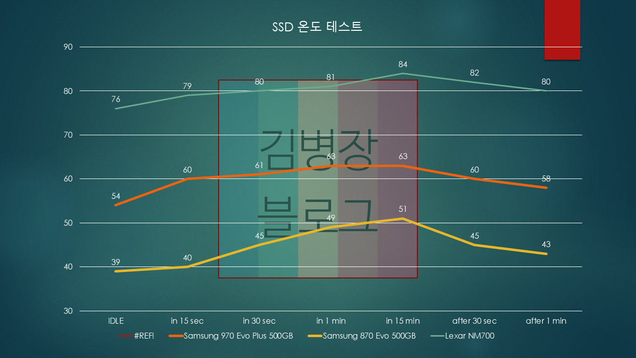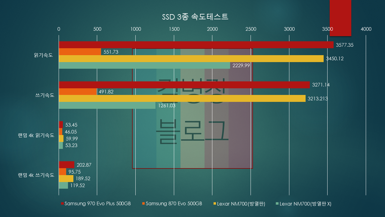 거의 970Evo Plus에 비비는 수준인데, 방열판을 제거하고 테스트하면 성능이 확 떨어집니다.