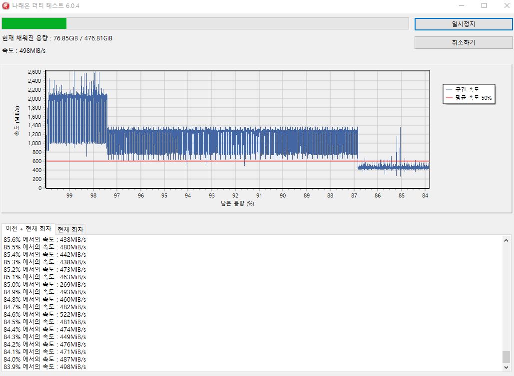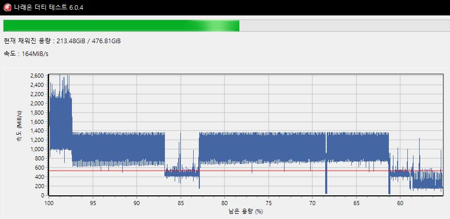 추가로 더티테스트를 진행해본 결과, 방열판이 없을 경우 최대 속도가 2200MB/s이며, 15GB정도 연속 쓰기를 할 경우 쓰로틀링으로 인해 1200MB/s까지 떨어지게 됩니다.
