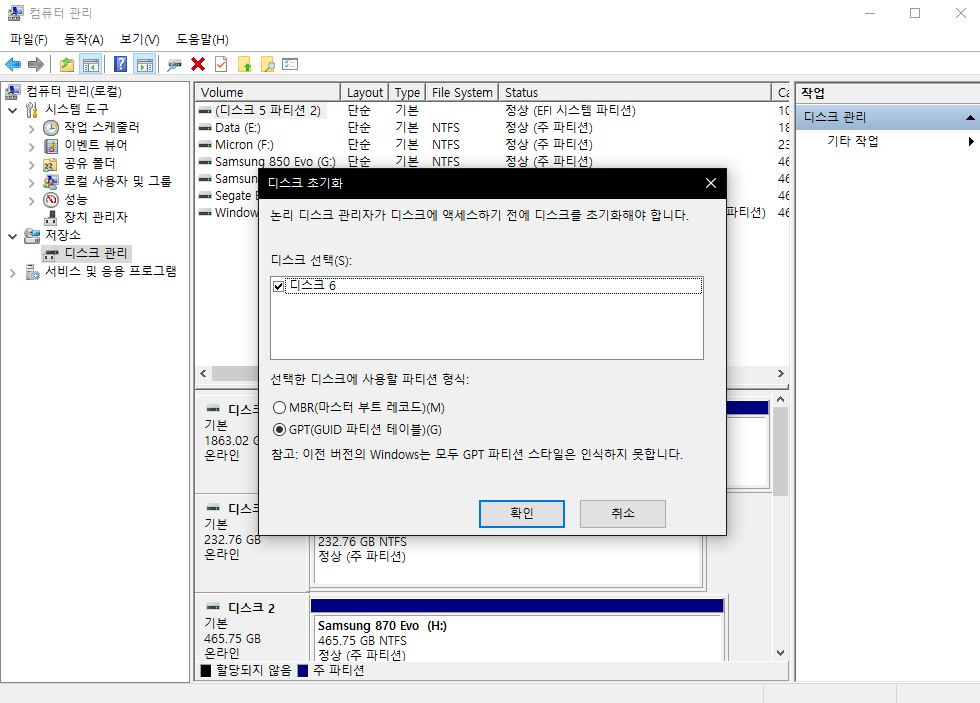 새로운 SSD이기 때문에, 디스크 관리에서 디스크 초기화 및 파티션 생성을 해줍니다.