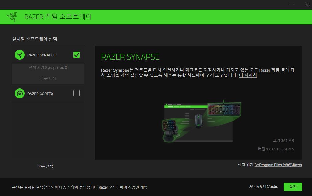 동글을 끼우면 자동으로 Razer Synapse 설치를 위한 프로그램이 켜집니다.