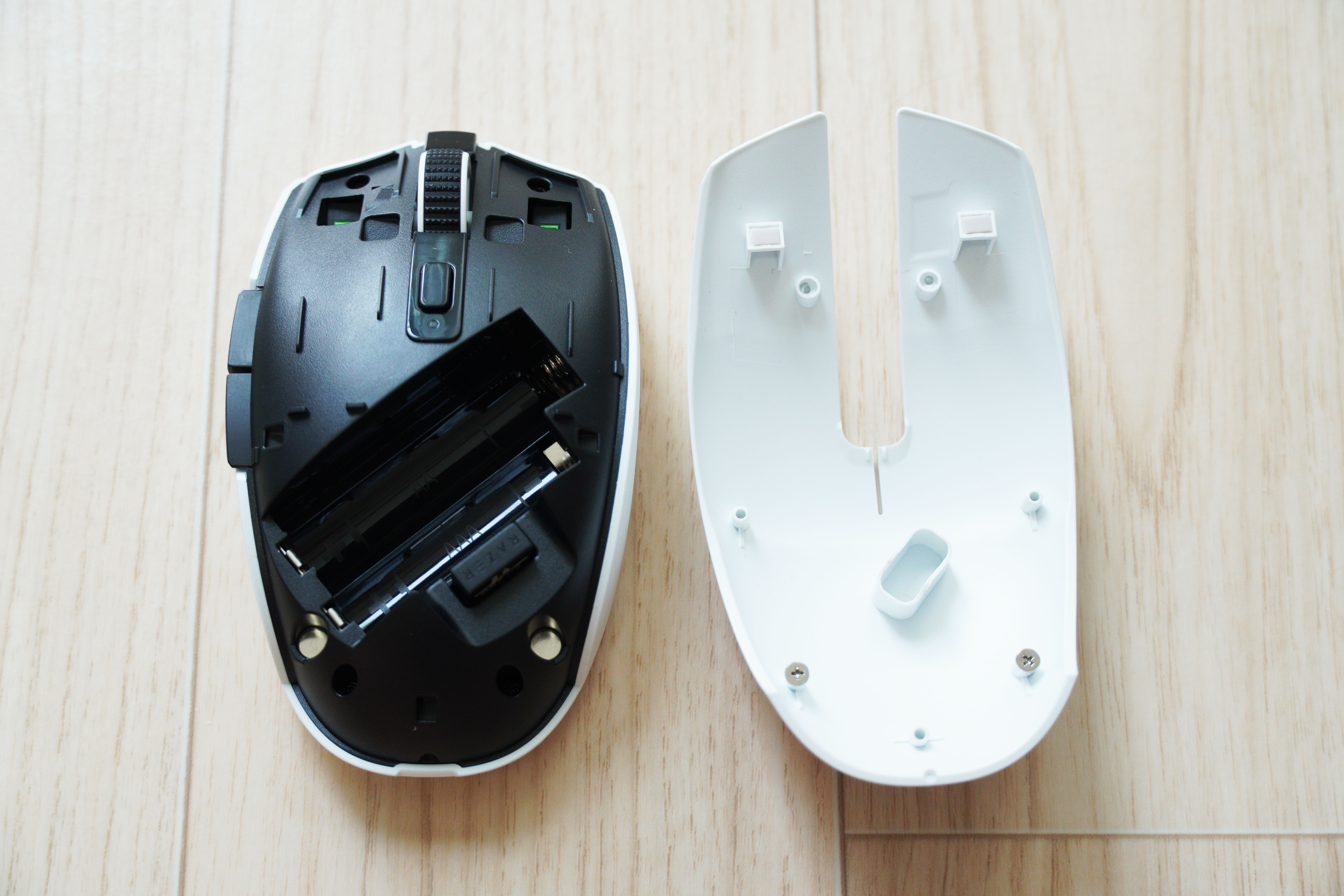 내부에는 레이저 USB 동글과 배터리 삽입부가 있습니다.