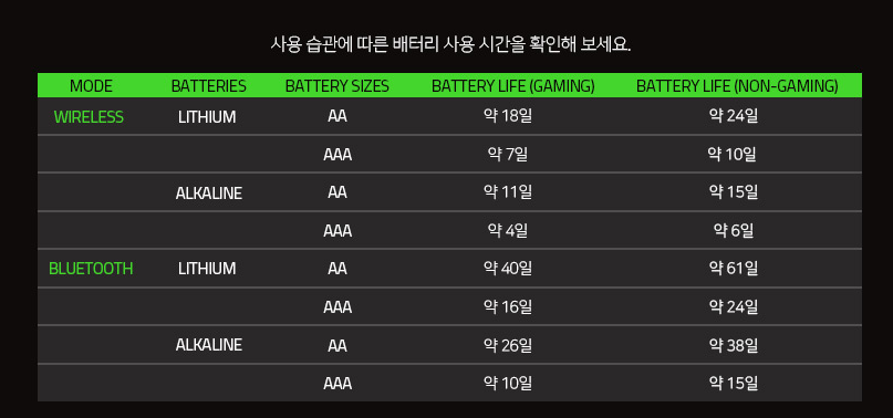 배터리의 경우 AAA 혹은 AA 건전지 "1개" 만 넣을 수 있습니다. 2개 넣은다고 사용시간이 늘어나는게 아니라, 고장이 날 수 있으니 꼭 1개만 넣어주세요.
