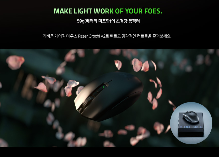 레이저 오로치 V2는 가벼운 무게와 빠른 반응 속도를 지닌 무선 마우스로써, 유선과 차이를 느끼지 못한 빠른 반응속도를 지닌 게이밍 마우스 입니다.