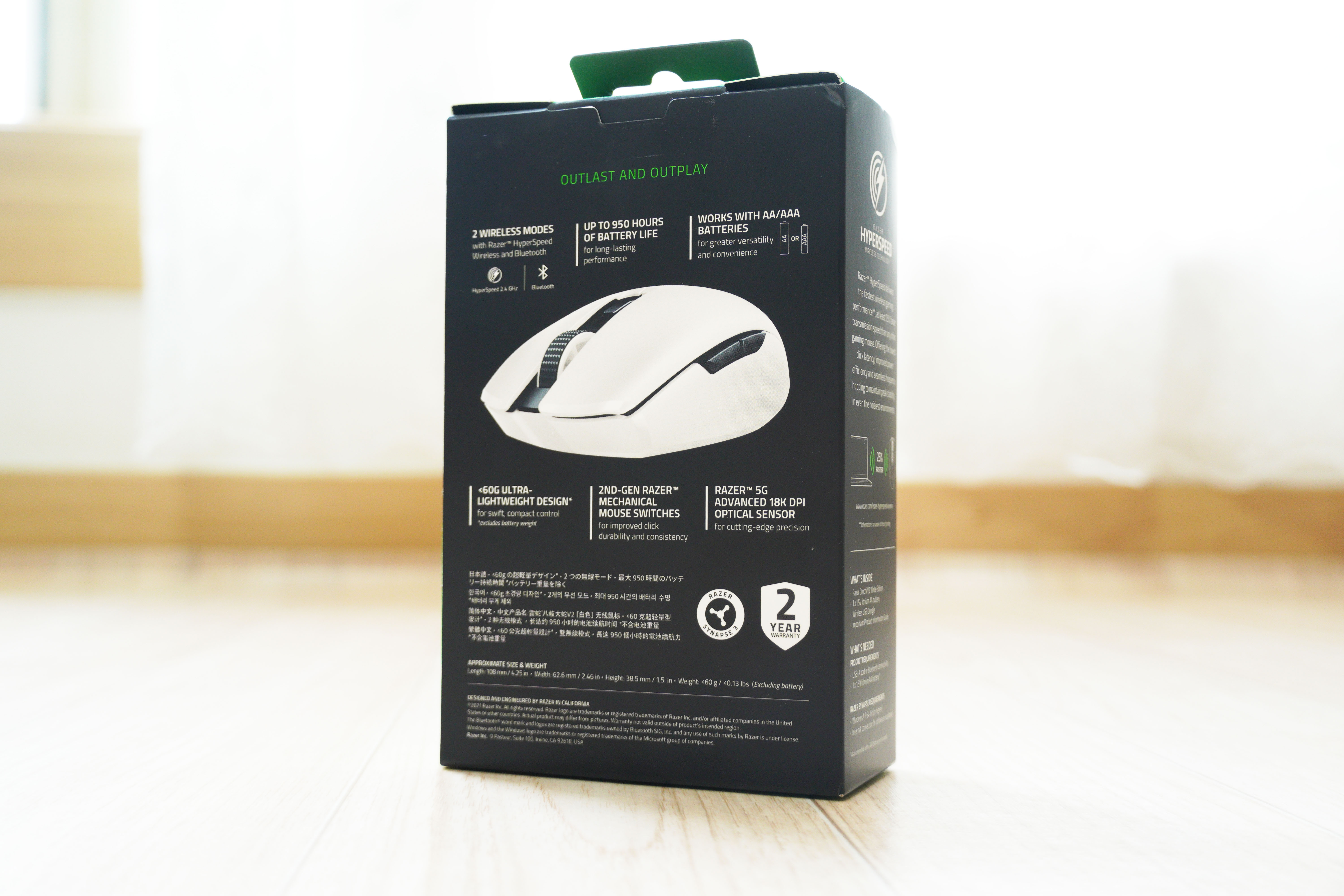 박스 전면을 보면 59g의 초경량 무선 마우스, 2개의 무선 모드, 최대 950시간의 배터리 시간을 지닌 마우스라는 특징이 적혀있습니다.