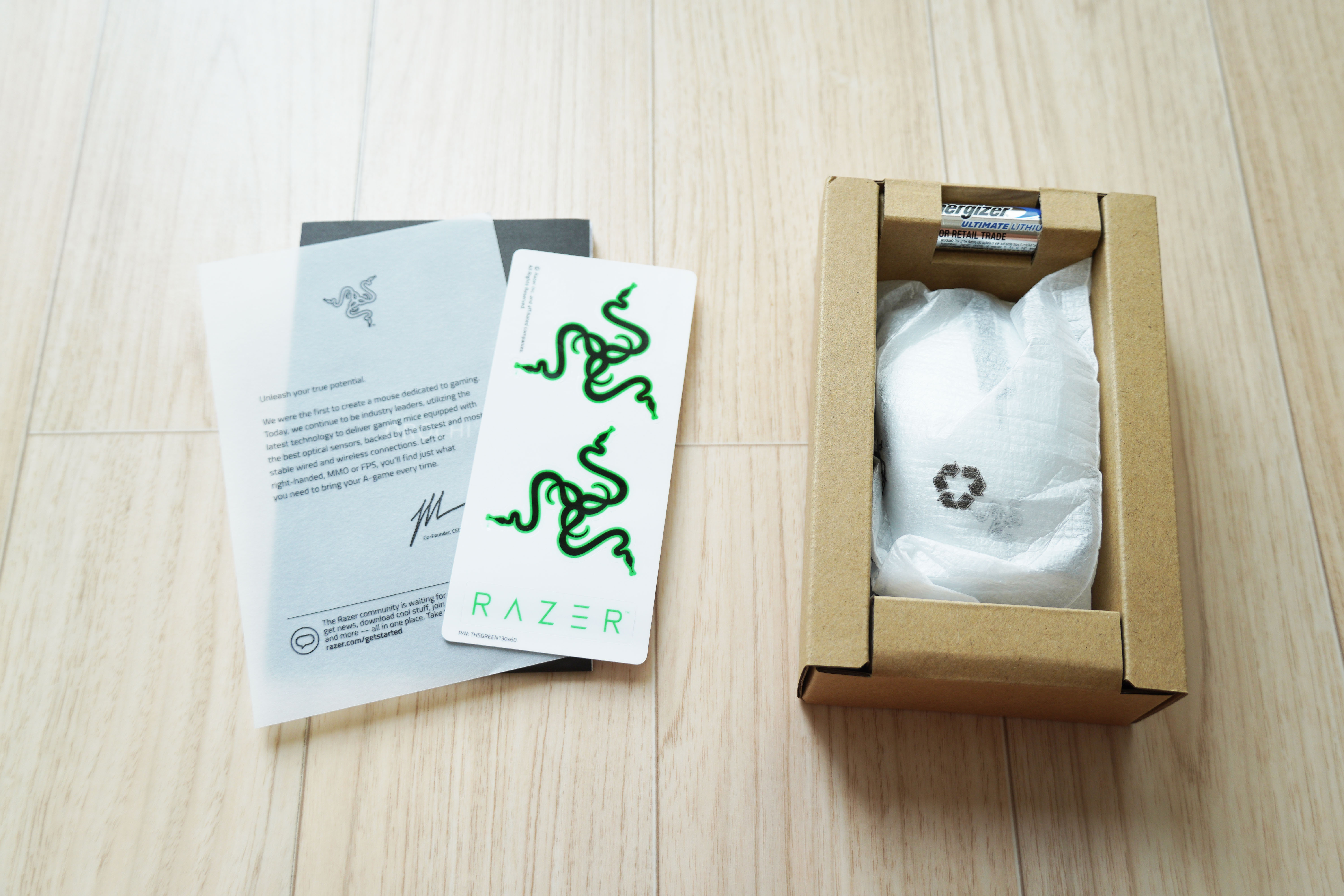 구성품은 설명서와 각종 문서, 레이저 스티커와 제품 본품, AA배터리 1개가 들어있습니다.