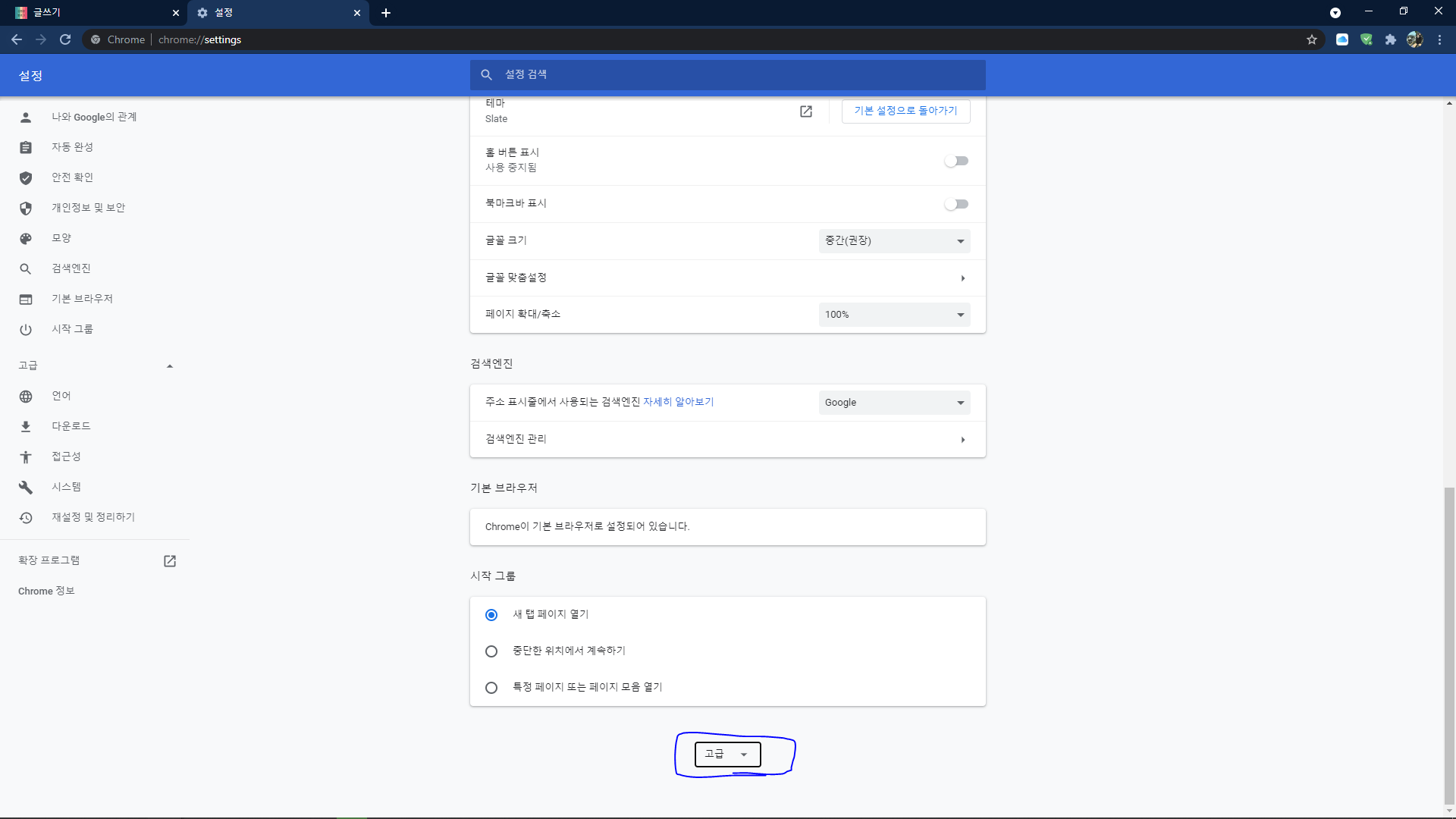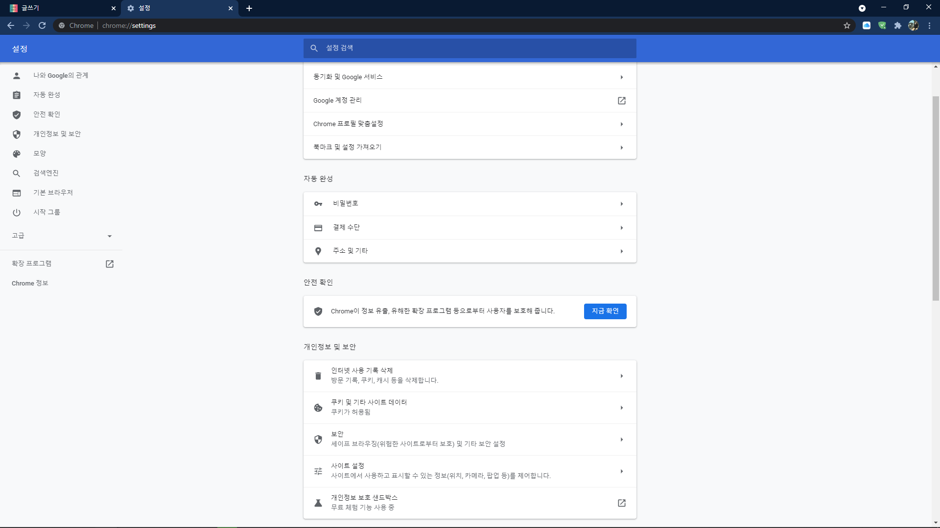 그러면, 크롬의 환경설정에 들어오게 됩니다.