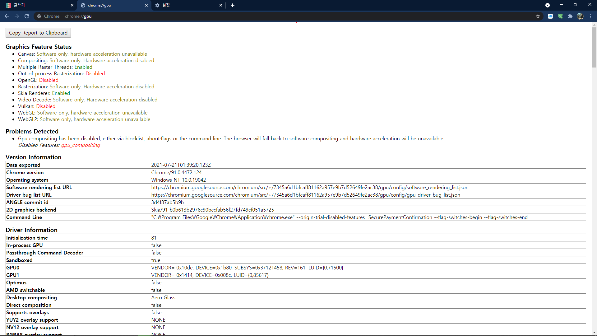 꺼지면, Software Only, Hardware Acceleration unavailable이라 나오게 되죠.