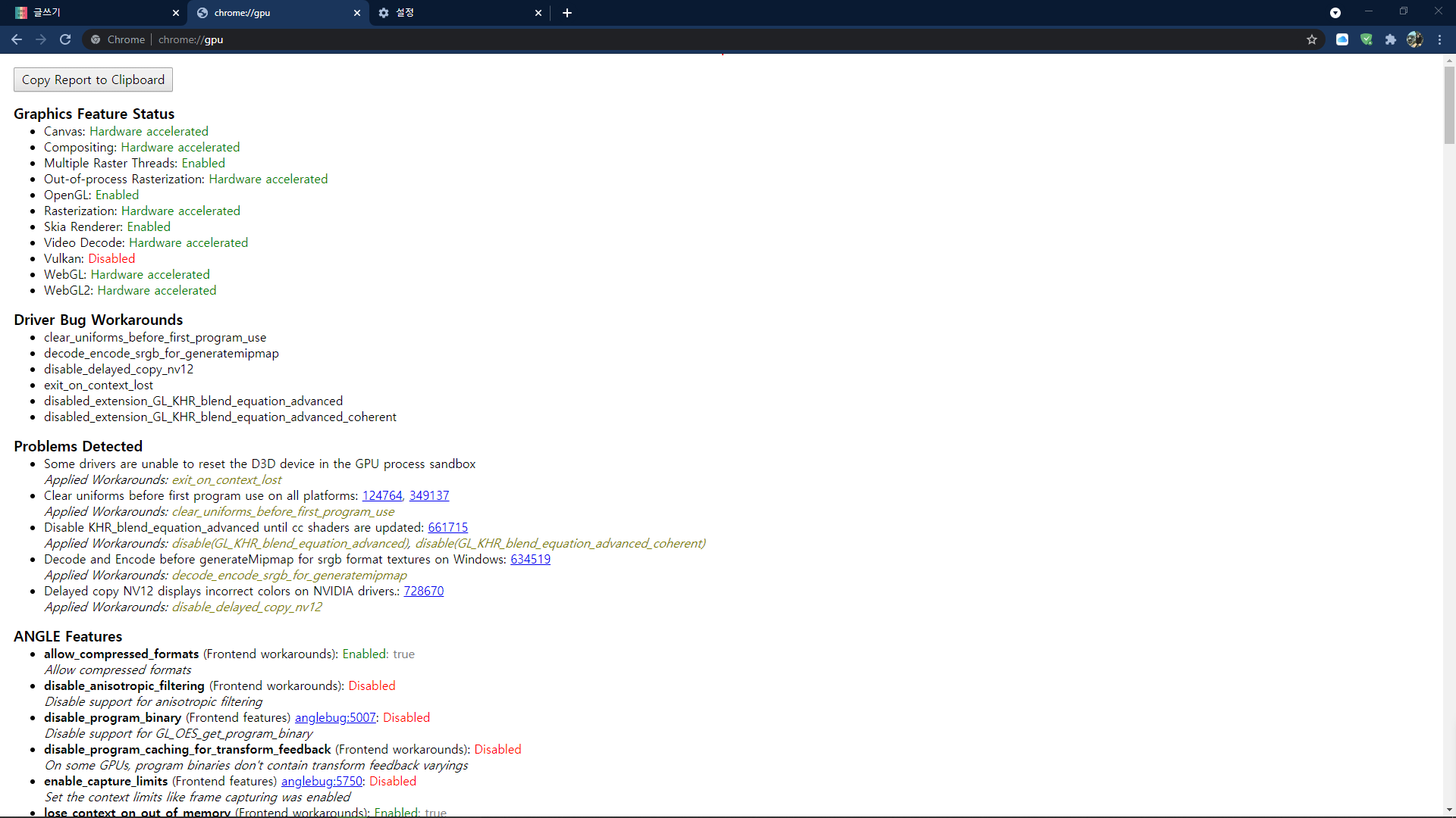 chrome://gpu/ 를 주소창에 입력하고 들어갑니다.