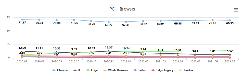 사람들이 가장 많이 쓰는 브라우저는, 한국을 기준으로 크롬 - 엣지 - 인터넷 익스플로어나 웨일, 사파리 등의 순서로 많이 사용되고 있습니다.