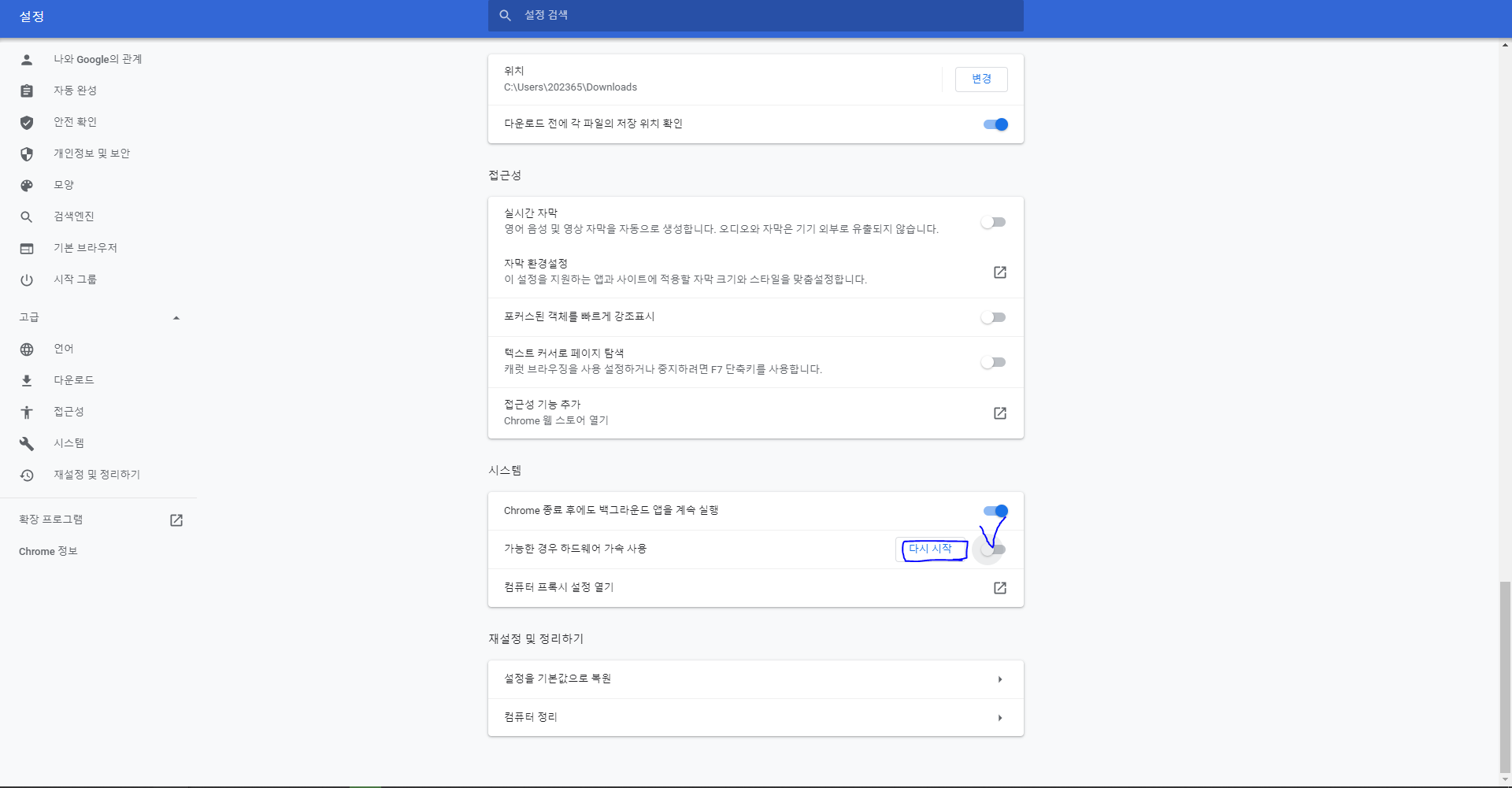 가능한 경우 하드웨어 가속 사용을 체크 해제 후, 다시시작을 눌러줍니다.