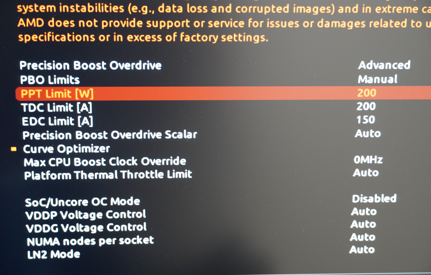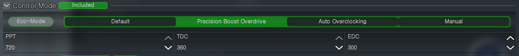 들어가시면 Precision Boost Overdrive가 있습니다. Advanced로 하신 후, PBO Limits를 Manual로 하시면 저렇게 PPT, TDC, EDC를 조절할 수 있습니다.