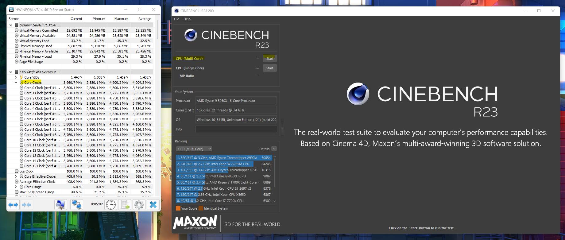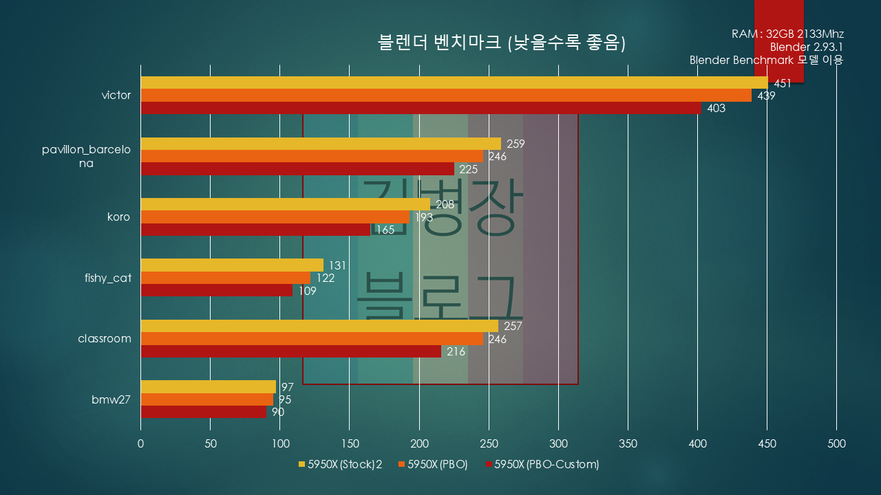 저같은 경우 메모리가 ddr4 초기에 나온 메모리를 사용중이라 2133mhz에 8 x 4 GB 메모리인 상태라 시네벤치 점수나 블렌더 벤치마크 성능이 다른 5950x 유저보다 낮게 나오지만, 메모리 클럭을 정규클럭인 3200까지 올려서 쓰신다면 더 높은 성능을 기대할 수 있습니다.