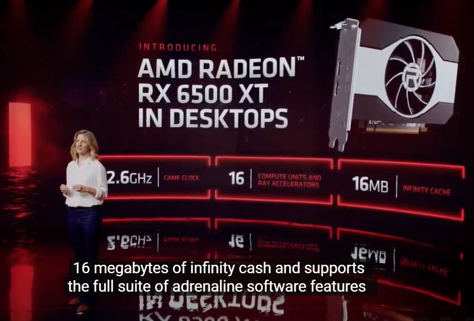 최대 2.6Ghz, 16개의 컴퓨트 유닛, 16MB의 인피니티 캐쉬가 탑재된 RX 6500XT입니다.