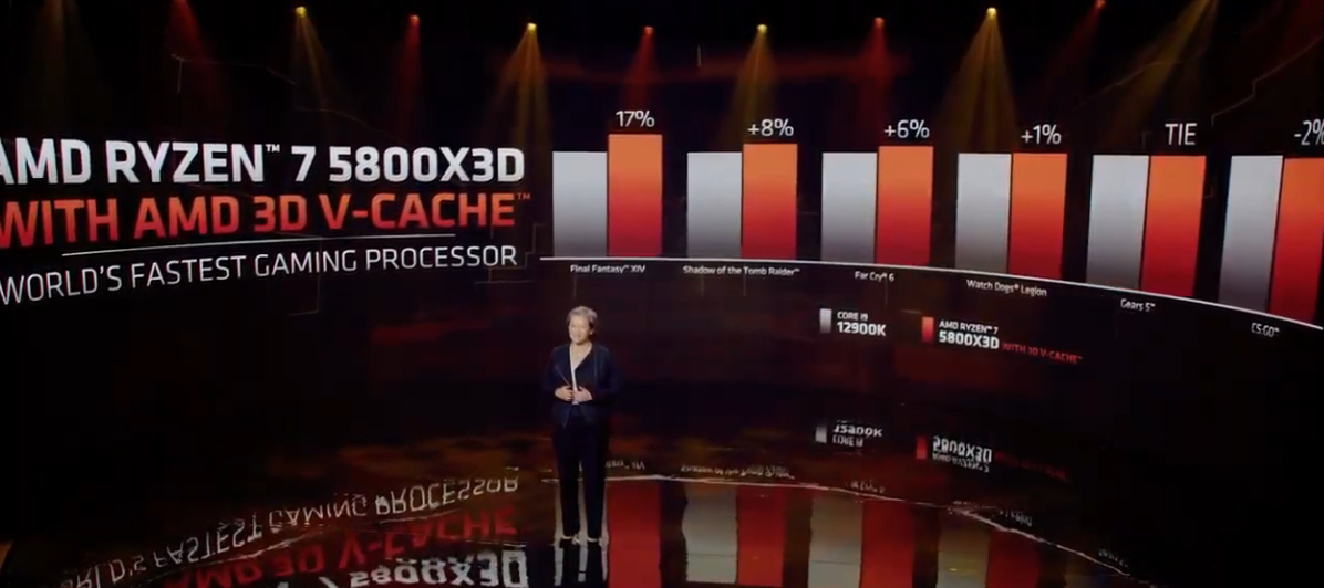 더불어 CPU 부분에서도 기존 프로세서에 3D-VCache를 적용, 경쟁사의 가장 높은 급의 12900k를 5800x 3d가 이기는 등, CPU부분에서도 높은 성능 향상을 이끌어 내는 좋은 모습을 보였으며,