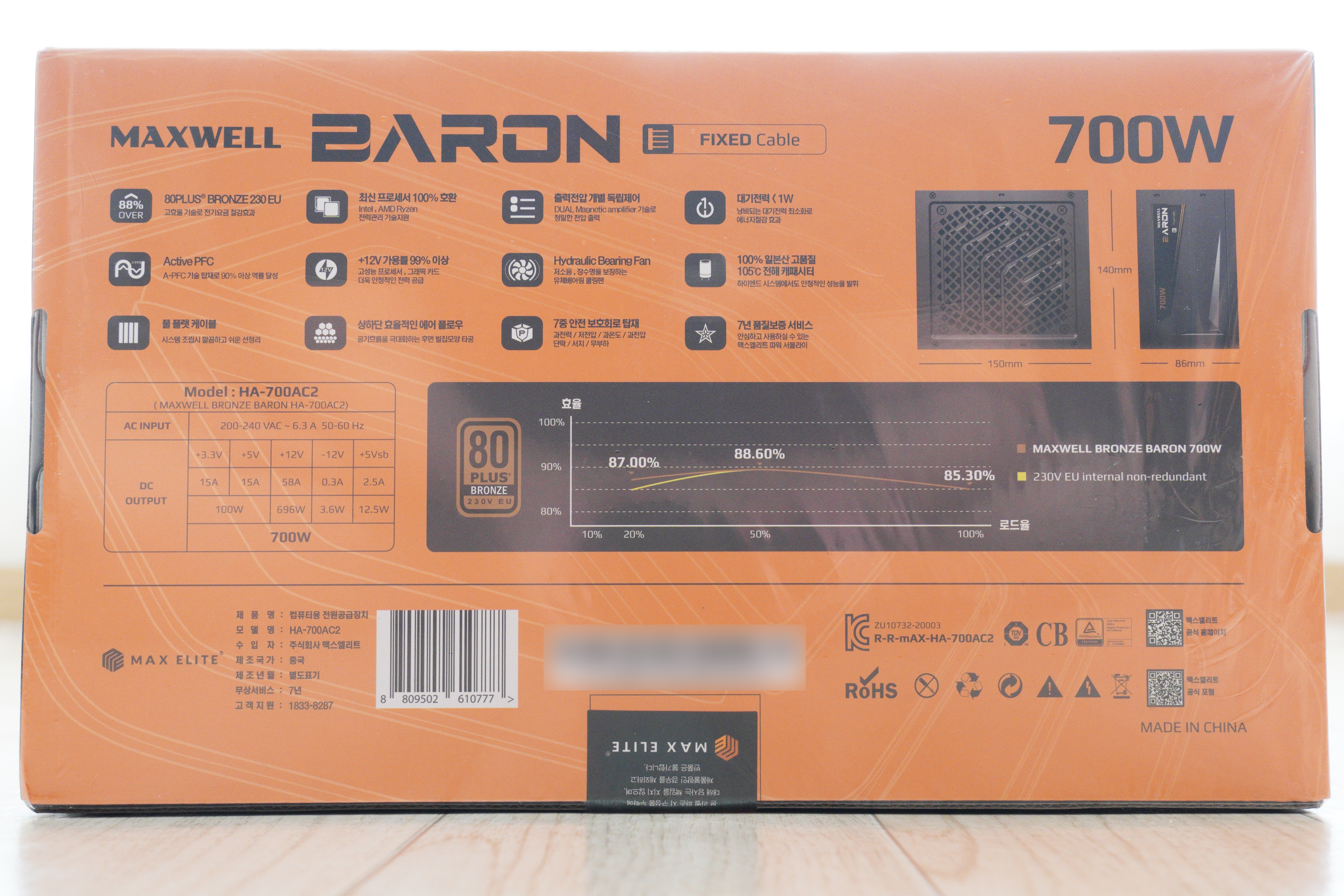 140mm x 150mm x 86mm의 크기를 지닌 700W 파워서플라이이며, 80Plus 브론즈 인증, 플랫케이블, 7종 보호회로, 7년 보증, 일본산 콘덴서 등 다양한 특징이 있으며, 추가로 시리얼 넘버가 있습니다.