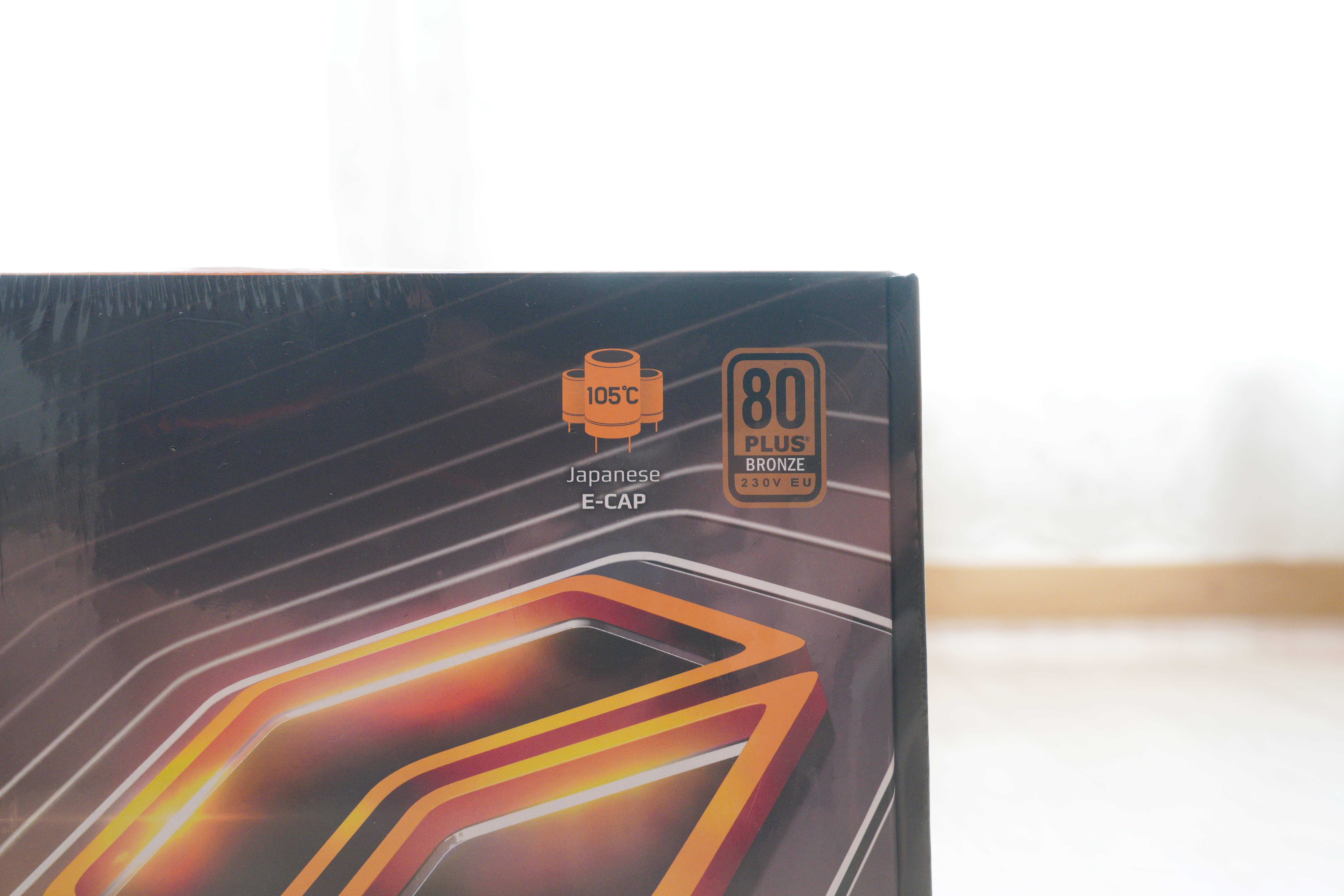 우측 상단에는 80PLUS 브론즈 등급 인증 마크와, 일본산 105도 콘덴서를 사용했다는 로고가 박혀있습니다.