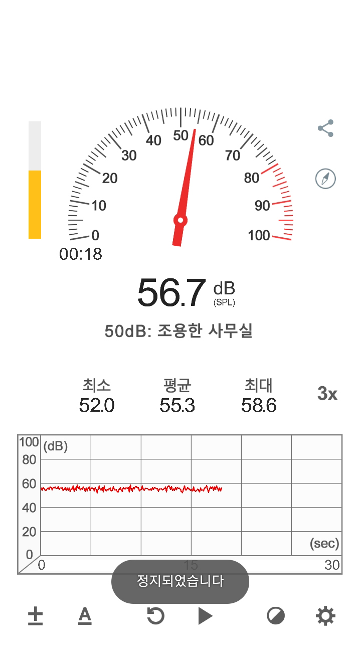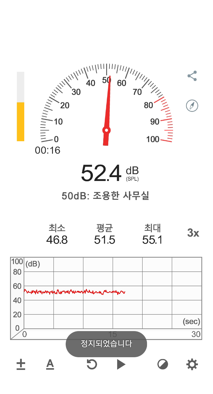 마지막으로 각종 벤치마크 프로그램으로 부하를 건 후 30분이 지난 뒤의 소음입니다. 51.5 db -> 55.3 db로, 약 4db정도 증가한 모습이며, 이정도 소음은 다른 PC 팬 소음에 묻혀 들리지 않는 수준이였습니다.