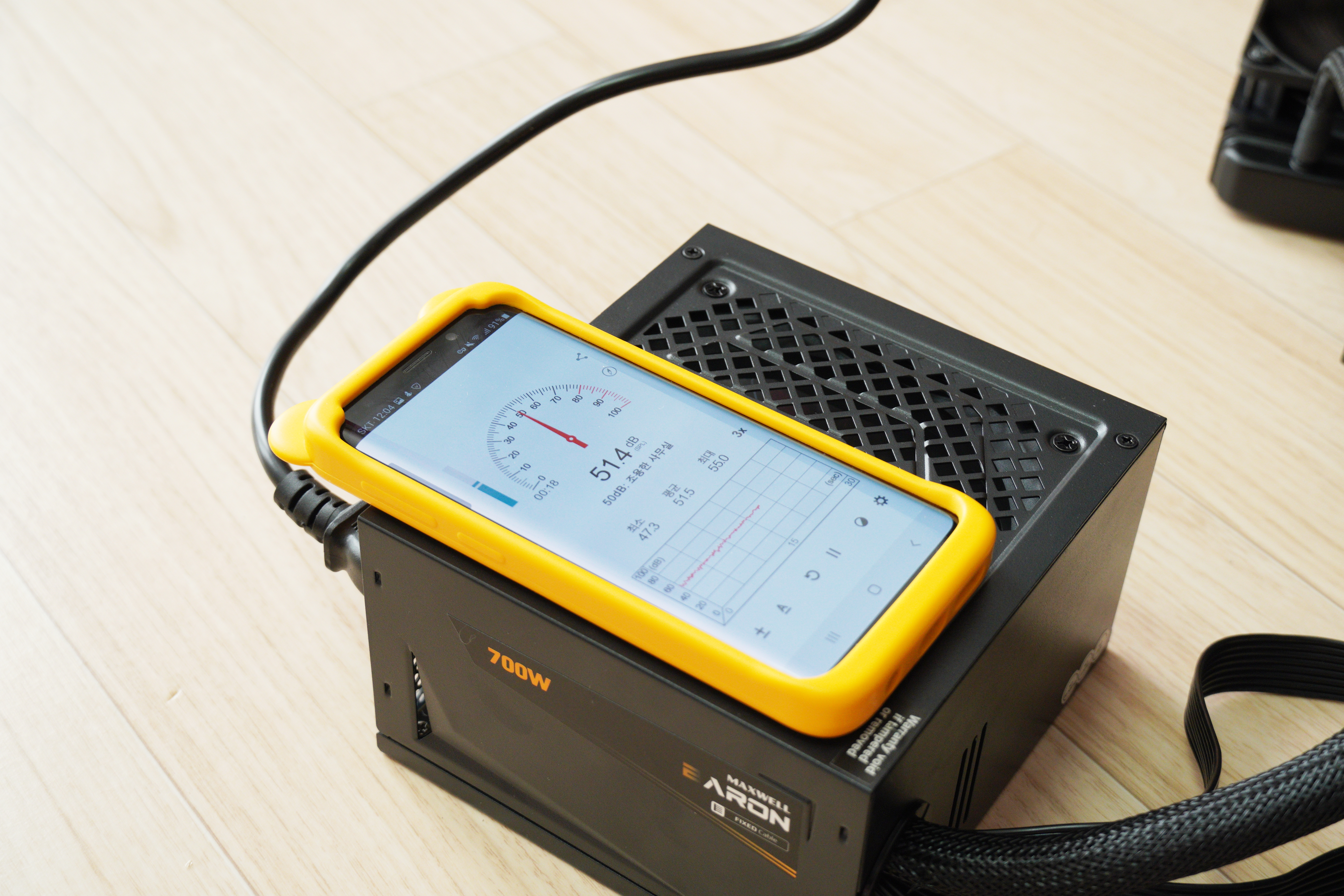 다음은 장착전에 간단한 소음 테스트를 진행하였습니다. 파워서플라이를 바깥에 배치한 후, 최대한 주변 소음을 억제, 동작하는 팬을 모두 끄고 테스트를 진행하였습니다.