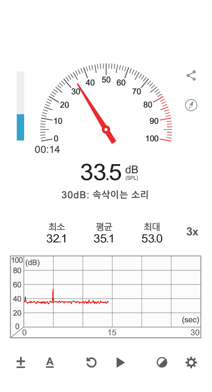 PC를 켜기 전 상태에서의 소음은 평균 35.1db이며, PC를 동작 한 후의 소음은 51.5db입니다.