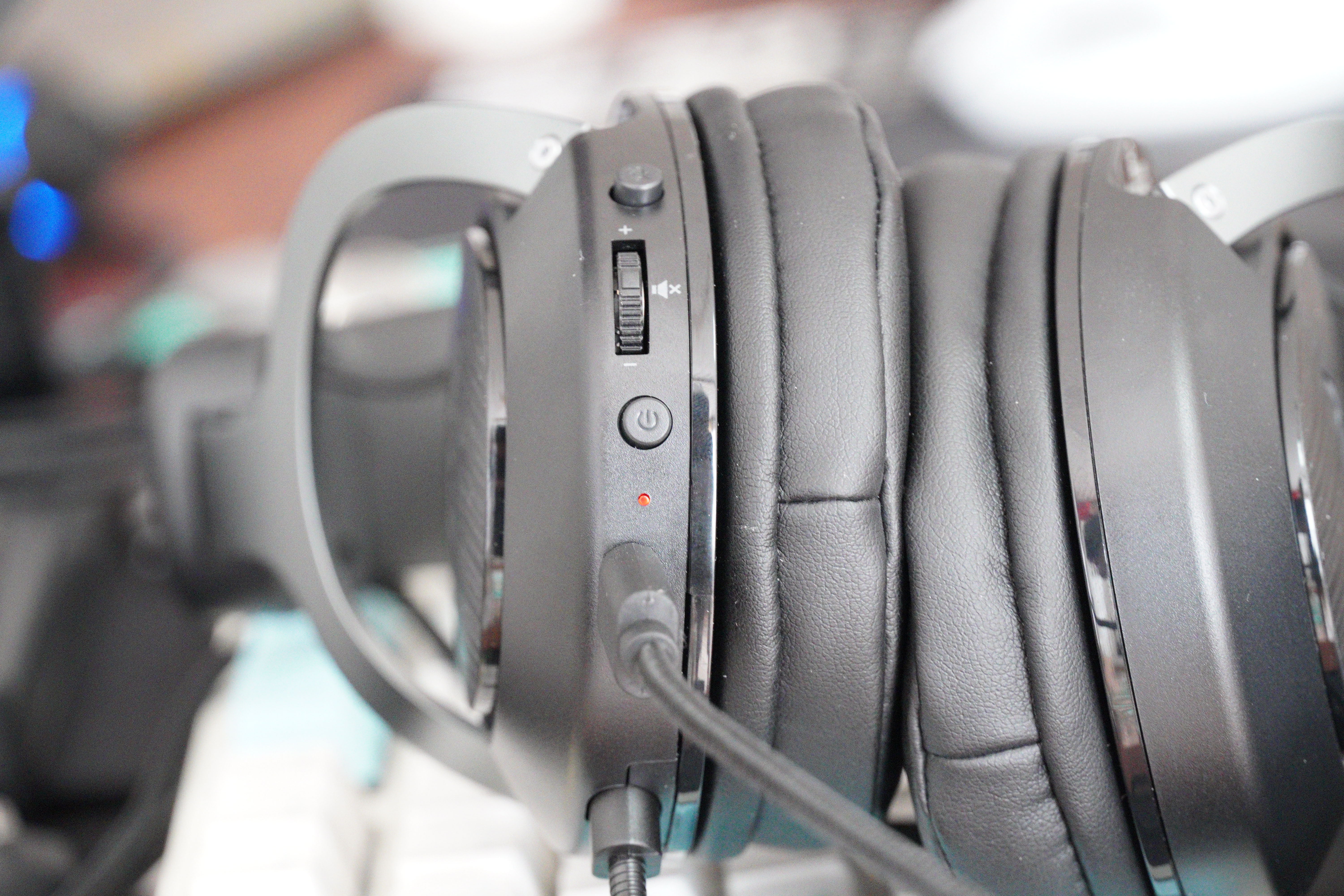 좌측 이어패드에 마이크와 각종 펑션버튼이 모여있는 형태입니다. 위쪽부터 마이크 음소거, 볼륨 조절, 전원, 충전용 Type-C 케이블입니다.