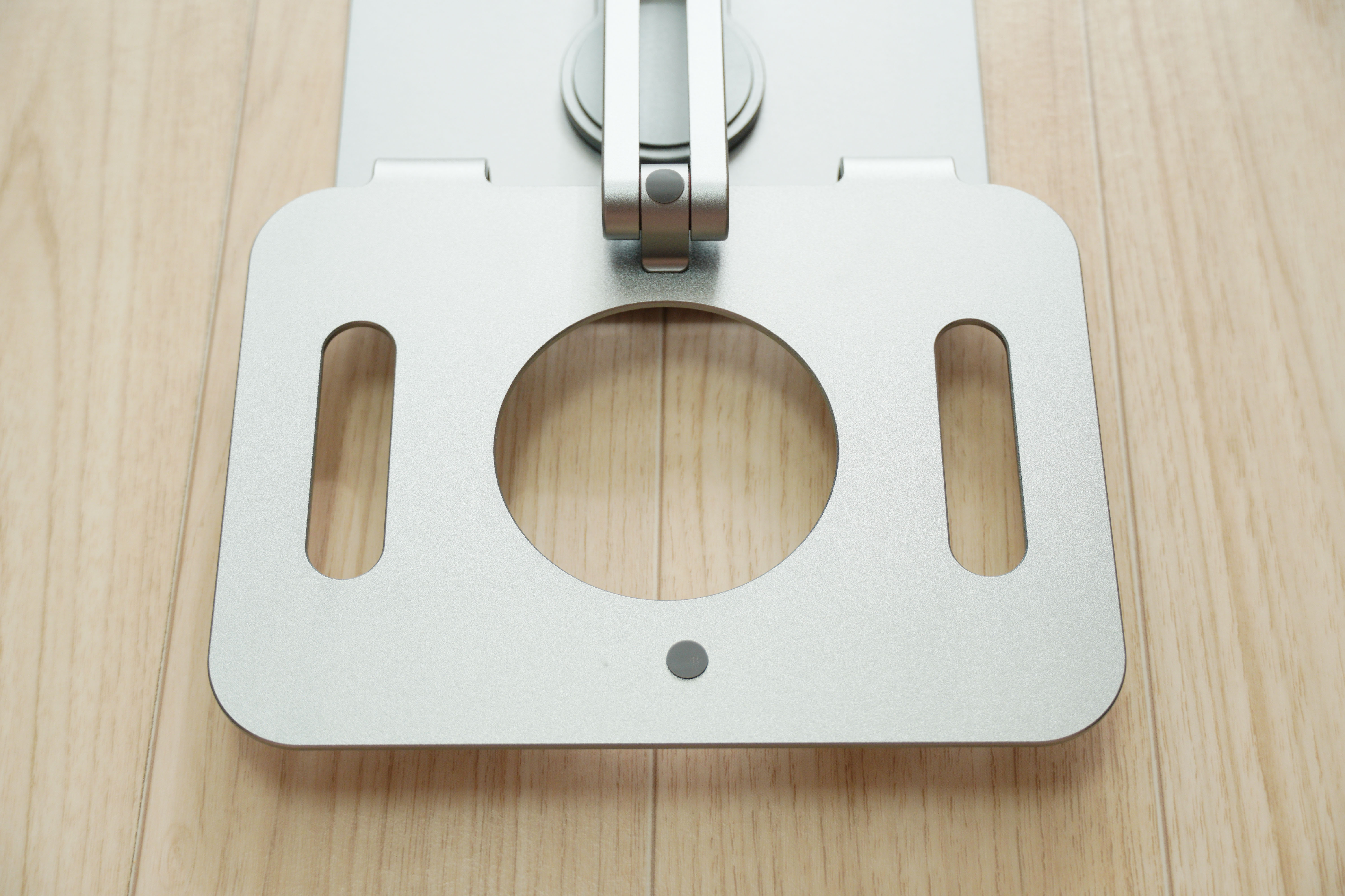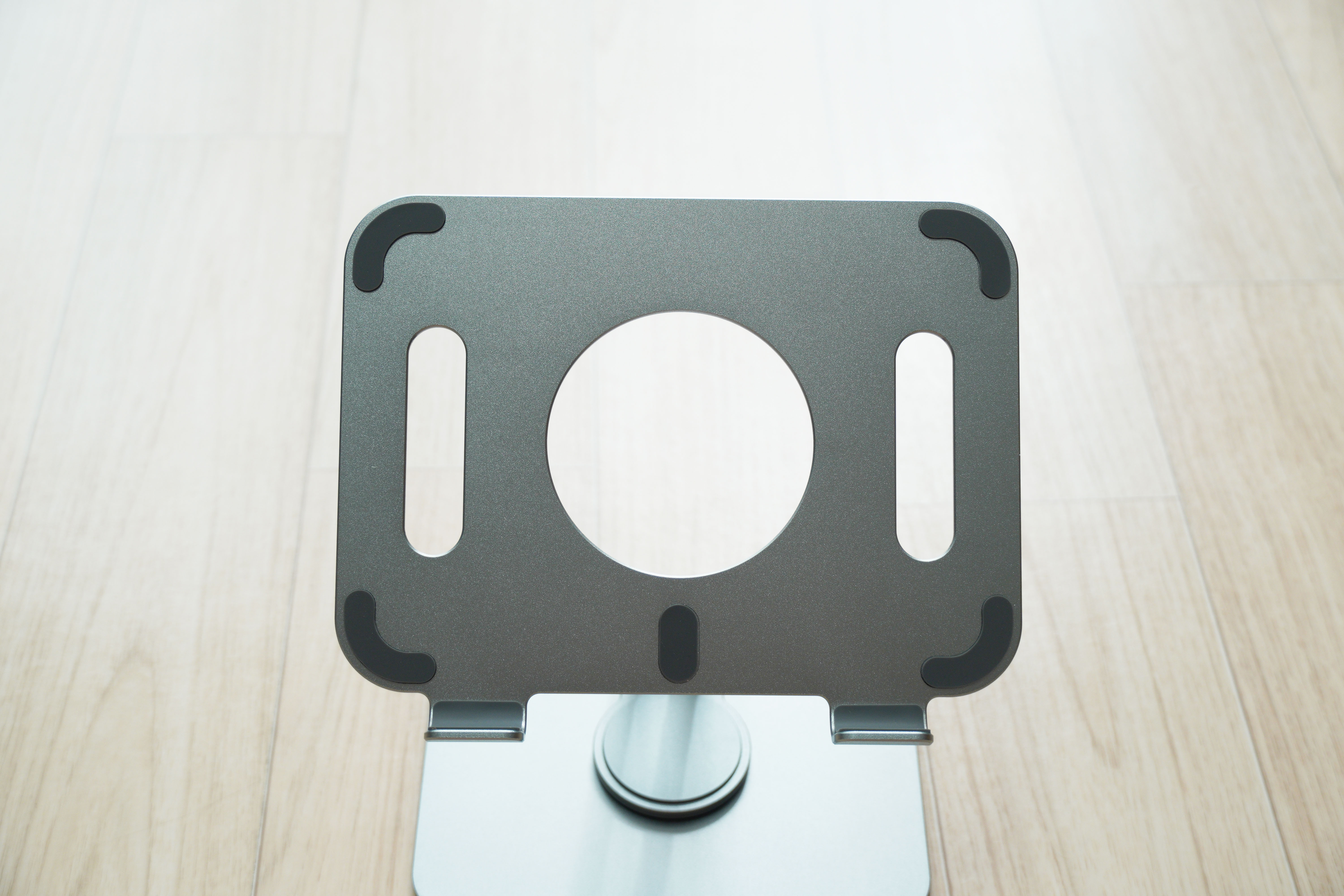 태블릿을 거치하는 부분에는 총 5개의 고무패드가 있어 미끄럼을 방지해주고, 거치 판에 구멍이 뚫려있어 원활한 공기 흐름을 제공하고, 무게를 줄이는데 이점이 있습니다.