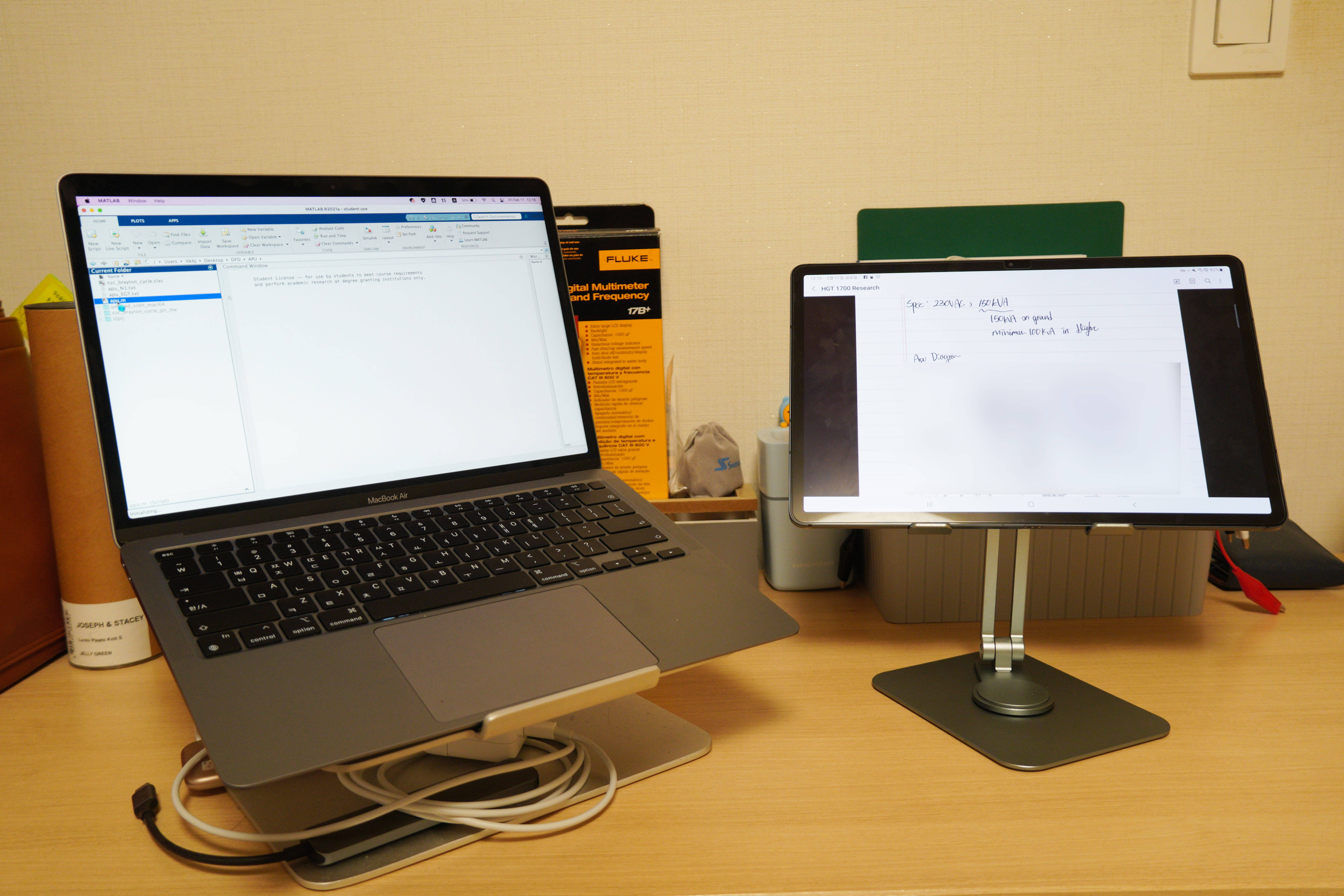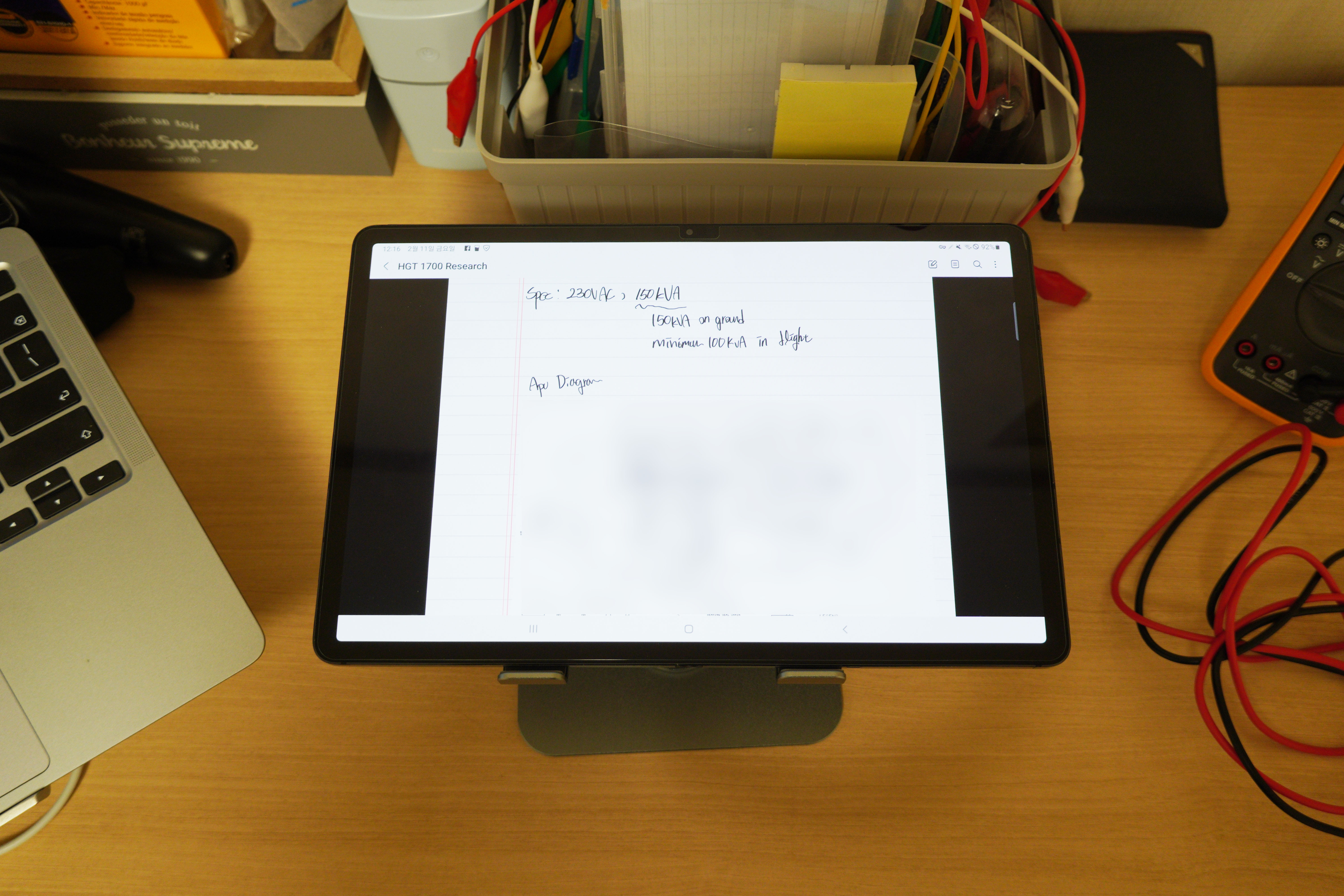 필기가 필요할때는 이런식으로 수평으로 조절하여 사용하였습니다. 별도로 들어있는 육각렌치로 하단 축을 좀 더 고정시키고 필기하니, 태블릿이 수평을 유지하고있어 필기에도 용이했습니다.