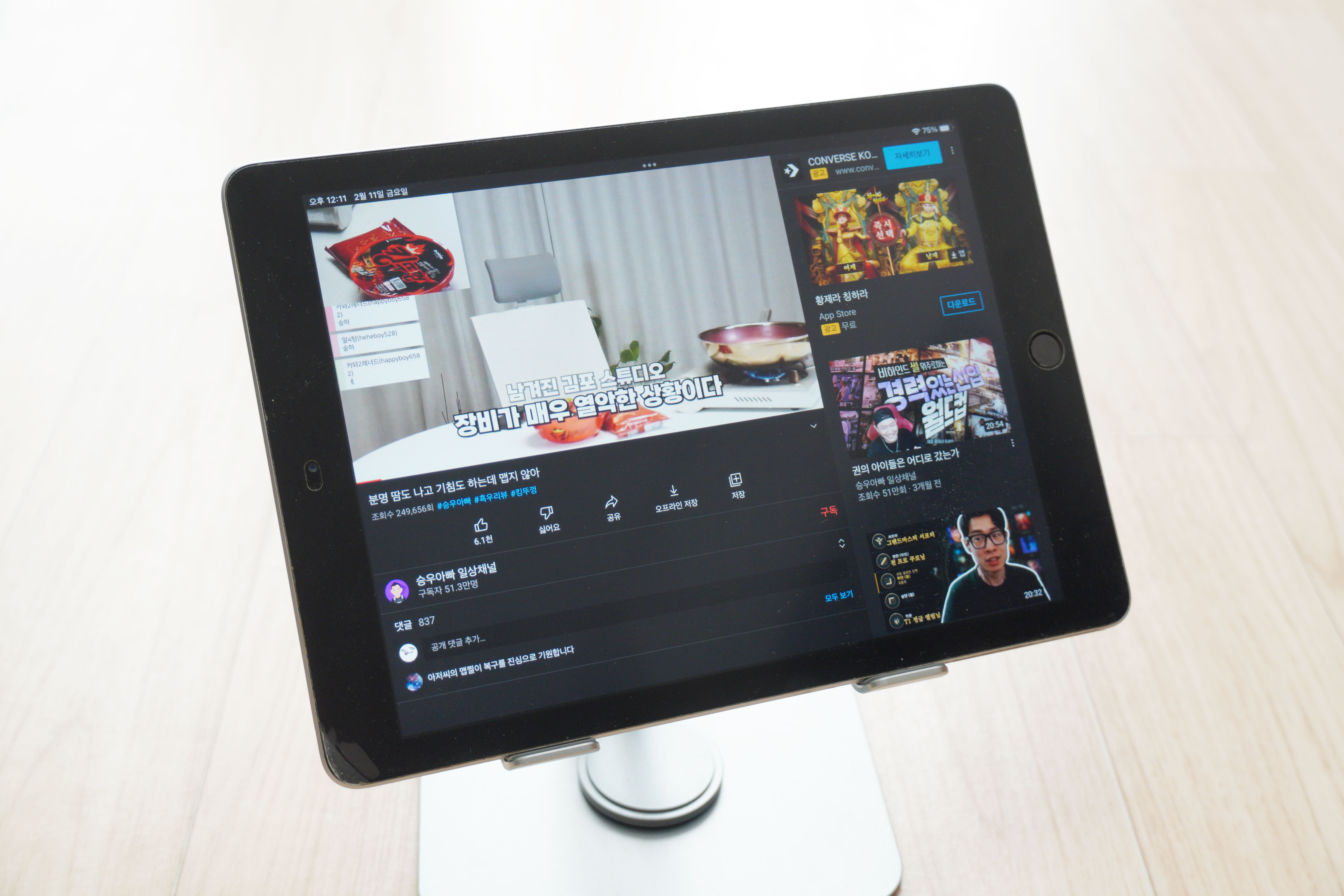 먼저 아이패드 6세대(9.7인치)를 거치해보았는데, 9.7인치라는 작은 크기의 태블릿을 거치하면 사이즈가 딱 맞아 안정감있게 사용할 수 있습니다.
