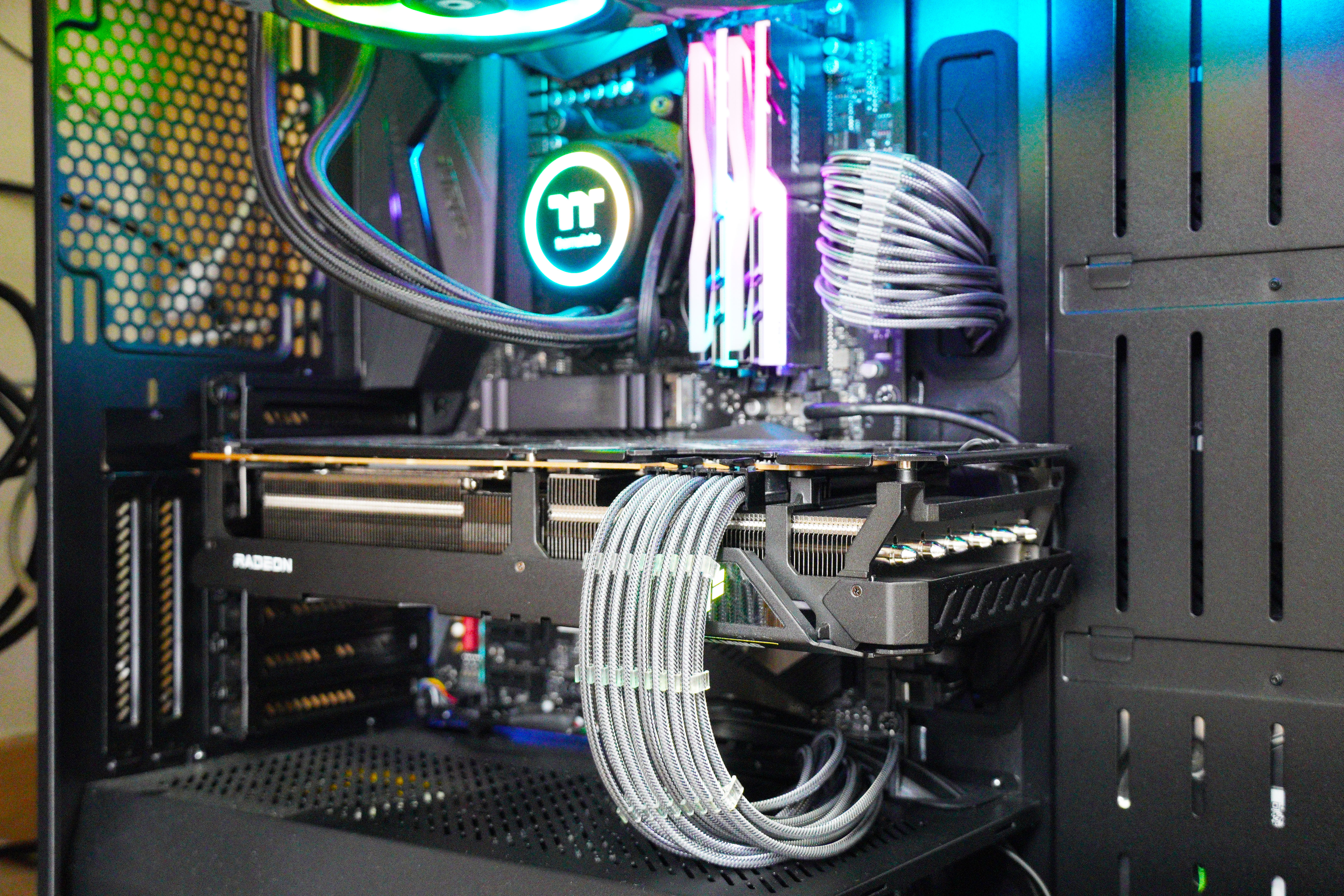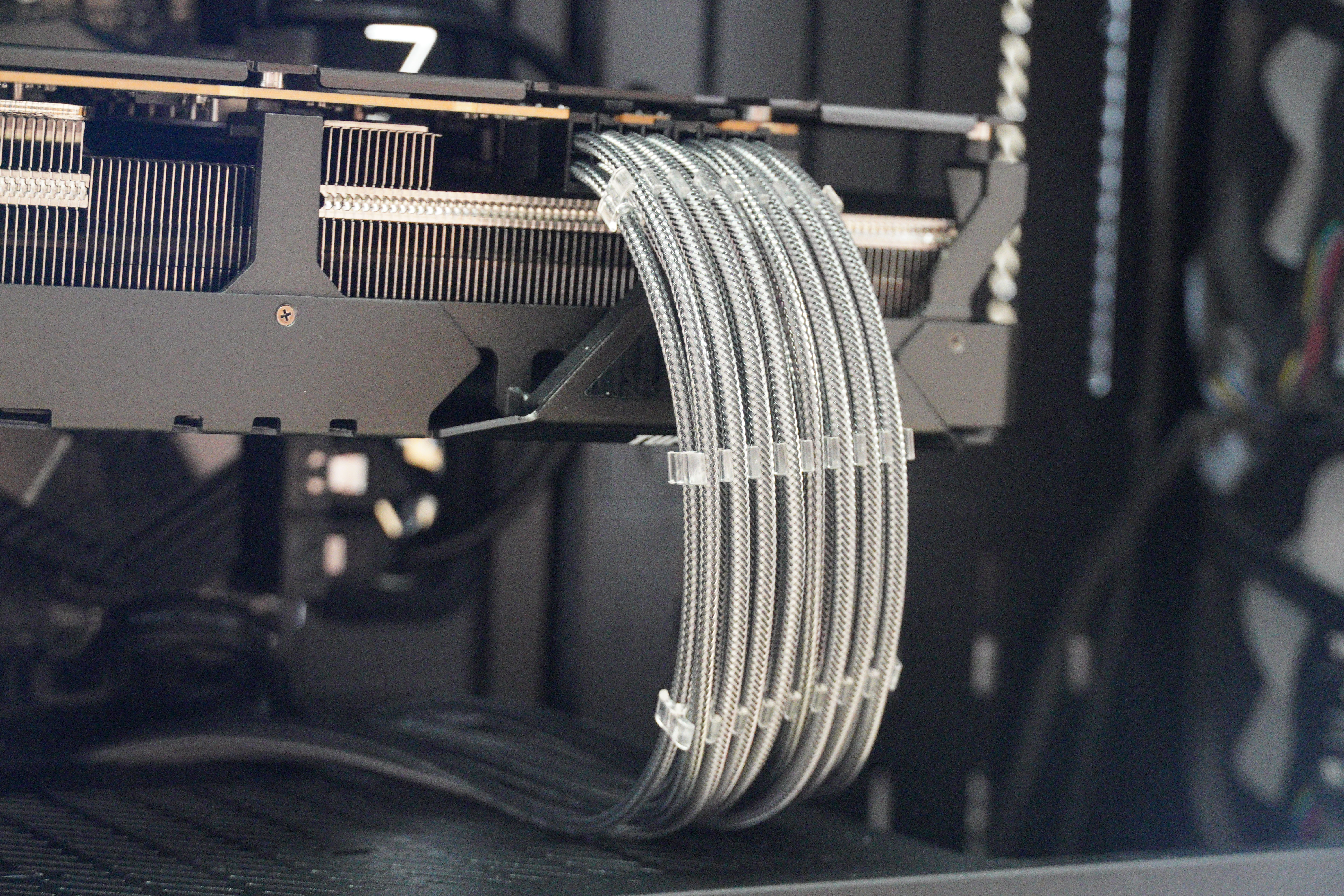 저같은경우 사용중인 6900XT가 8+8핀을 사용하므로, 동봉된 16x2 플라스틱 가이드를 이용해 정리한 모습입니다. 슬리빙 케이블은 연결되는 개수에 따라 맞는 플라스틱 가이드를 사용하여 꾸며주면 됩니다.