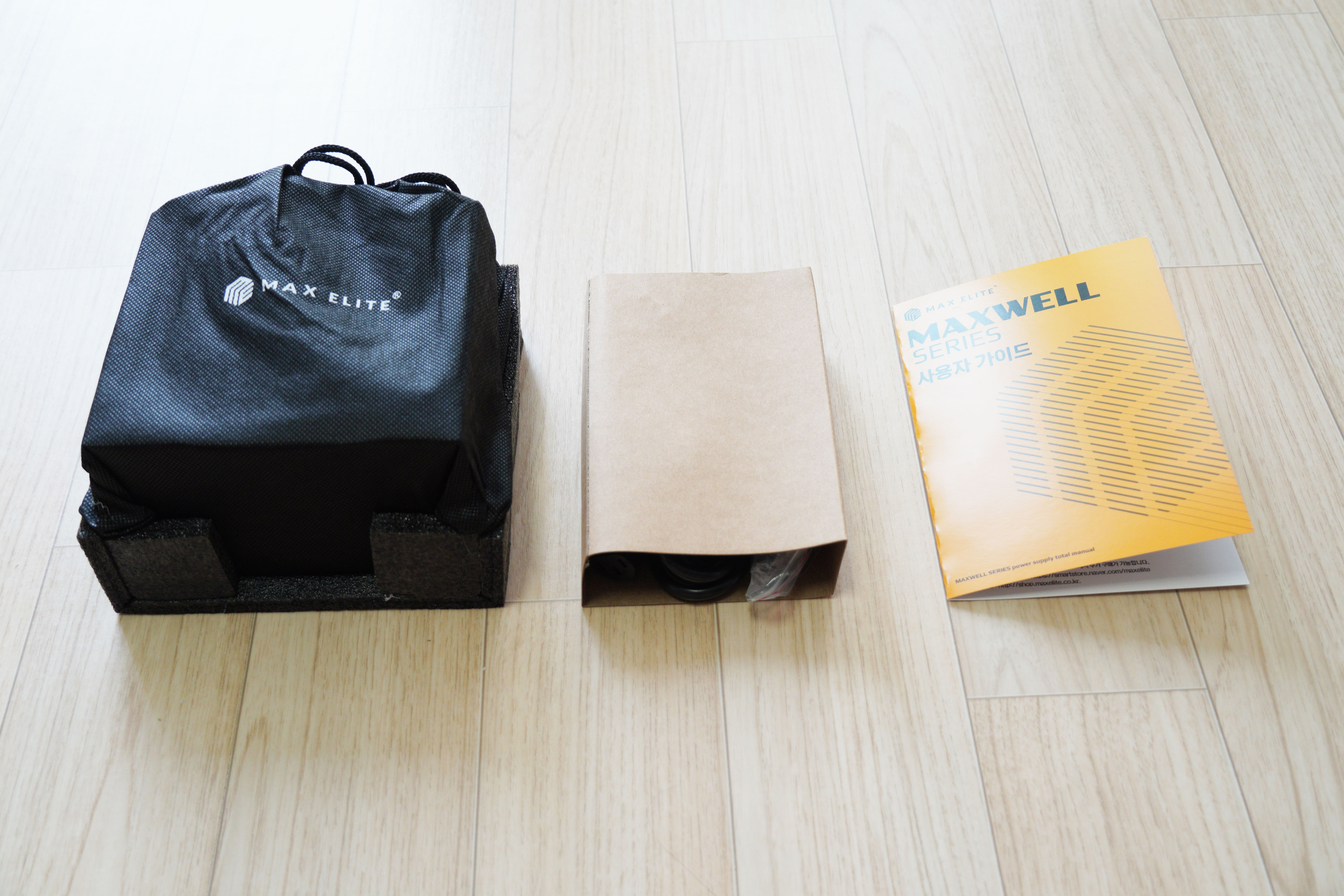 구성품의 경우 파우치에 담긴 파워서플라이 본품, 악세사리 박스, 사용자 가이드가 있습니다.