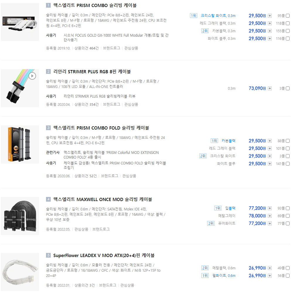 하지만 MAXWELL COUNT 제품군에 포함된 슬리빙 케이블은 파워서플라이에 직결되어 사용되는 케이블이기 때문에, 650mm, 700mm 길이의 케이블이 동봉되어있습니다. 그래서 동일한 길이의 케이블 가격을 살펴보시면 확실히 저렴한 모습을 볼 수 있습니다.