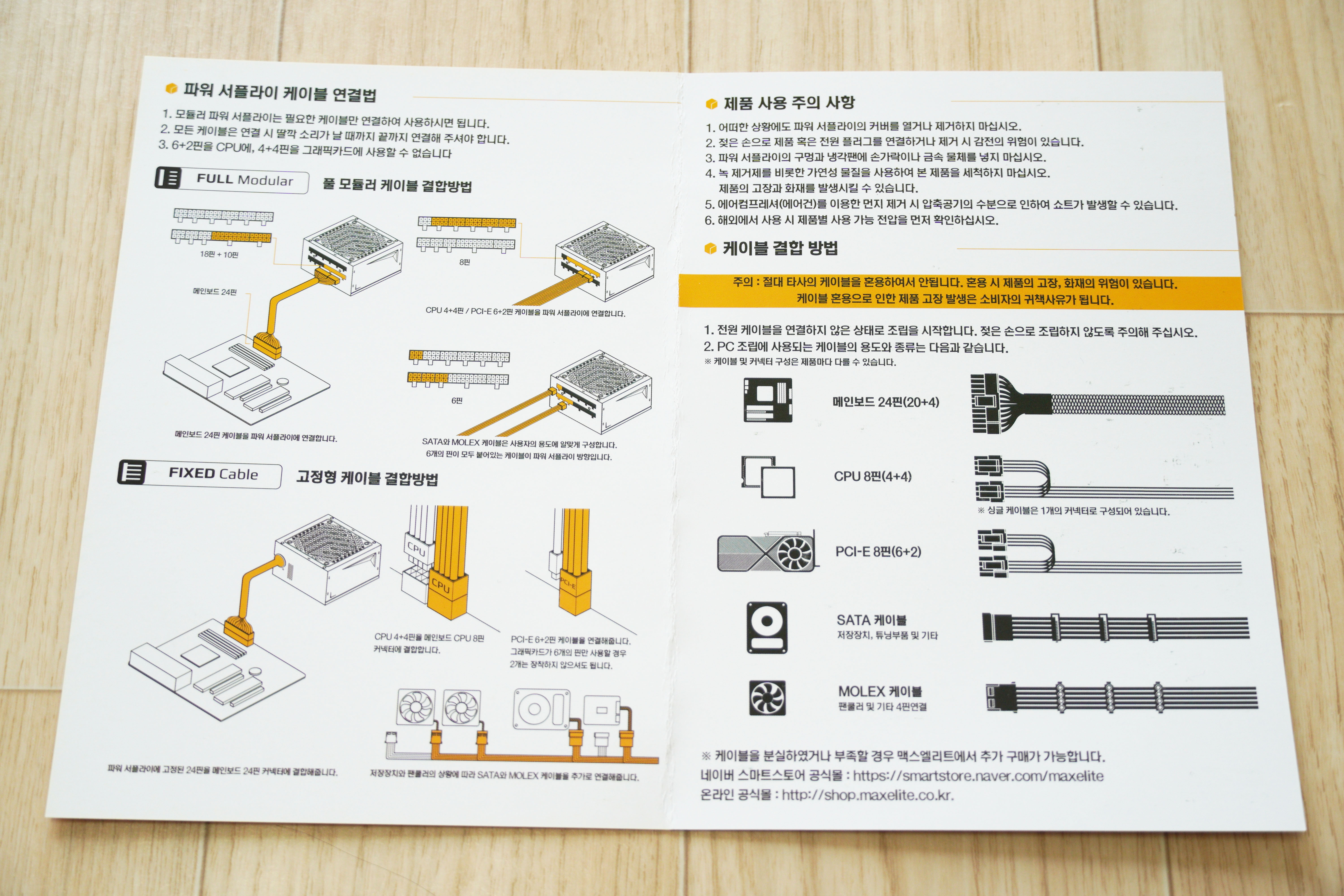 우측 하단의 경고를 보시면 아시겠지만, 기본적으로 맥스엘리트 MAXWELL 파워서플라이 전용 케이블이며, 다른 파워서플라이에 연결하였을 때 동작을 보증하지 않습니다.