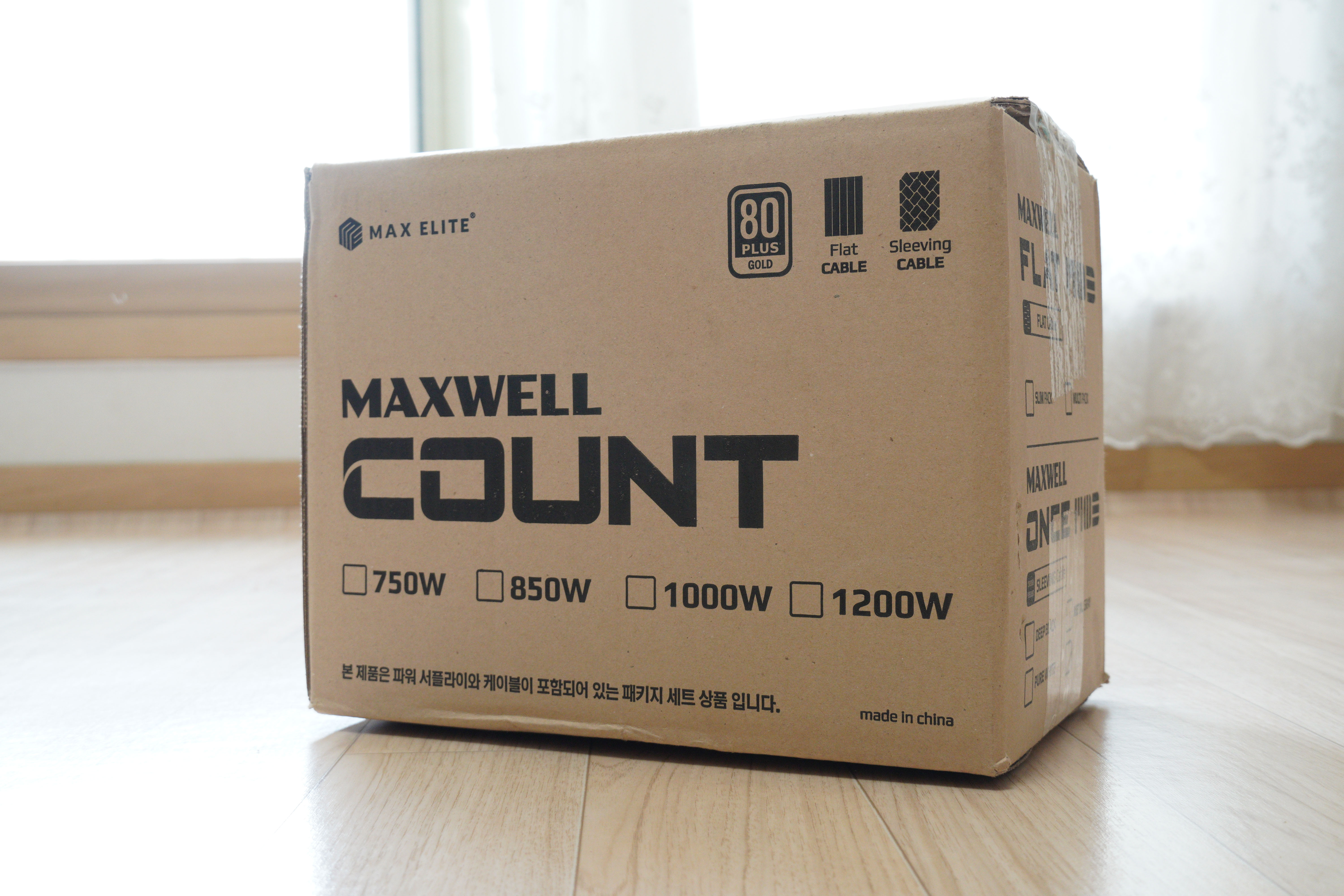 상자 전면을 보면 MAXWELL COUNT 라인업이라는 표기가 크게 되어있으며, 파워서플라이의 용량이 표기되어있습니다. 750W, 850W, 1000W, 1200W가 각각 표기되어있으나 현재는 750, 850W 제품만 출시되어 있으며, 1000, 1200W의 경우에는 출시 예정이라고 합니다.