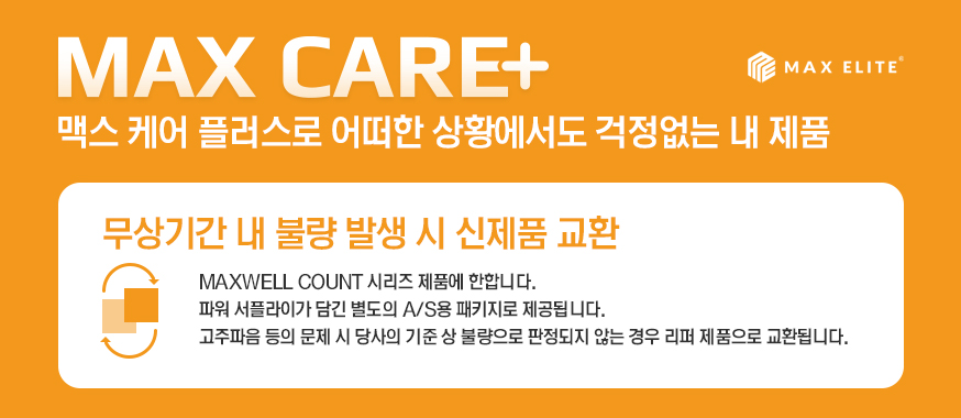 MAXWELL COUNT 제품군에는 MAX CARE+라는 보증 제도가 있어, 이 무상 10년 보증의 기간동안 파워서플라이의 회로적, 제품적인 결함이나 불량이 발생했을 경우 새제품으로 교환해주는 제도가 적용됩니다. 그만큼 파워서플라이의 품질에 대한 자신감이 보이는 대목입니다.